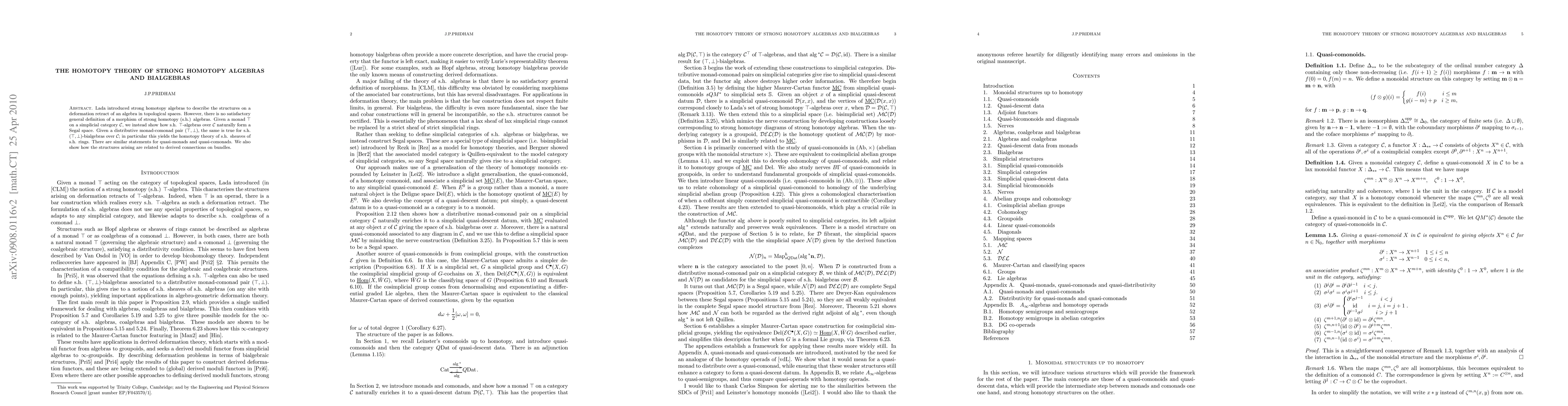 Lada introduced strong homotopy algebras to describe the structures on a deformation retract of an algebra in topological spaces. However, there is no satisfactory general definition of a morphism of strong homotopy (s.h.) algebras. Given a monad T on a simplicial category C, we instead show how s.h. T-algebras over C naturally form a Segal space. Given a distributive monad-comonad pair (T, S), the same is true for s.h. (T, S)-bialgebras over C; in particular this yields the homotopy theory of s.h. sheaves of s.h. rings. There are similar statements for quasi-monads and quasi-comonads. We also show how the structures arising are related to derived connections on bundles.