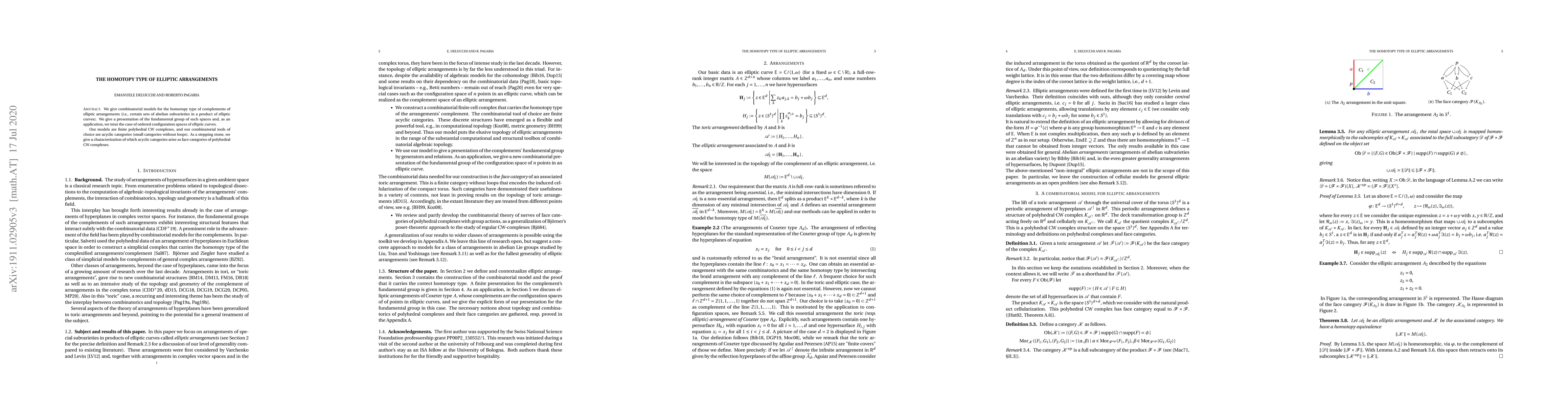We give combinatorial models for the homotopy type of complements of elliptic arrangements (i.e., certain sets of abelian subvarieties in a product of elliptic curves). We give a presentation of the fundamental group of such spaces and, as an application, we treat the case of ordered configuration spaces of elliptic curves. Our models are finite polyhedral CW complexes, and our combinatorial tools of choice are acyclic categories (small categories without loops). As a stepping stone, we give a characterization of which acyclic categories arise as face categories of polyhedral CW complexes.