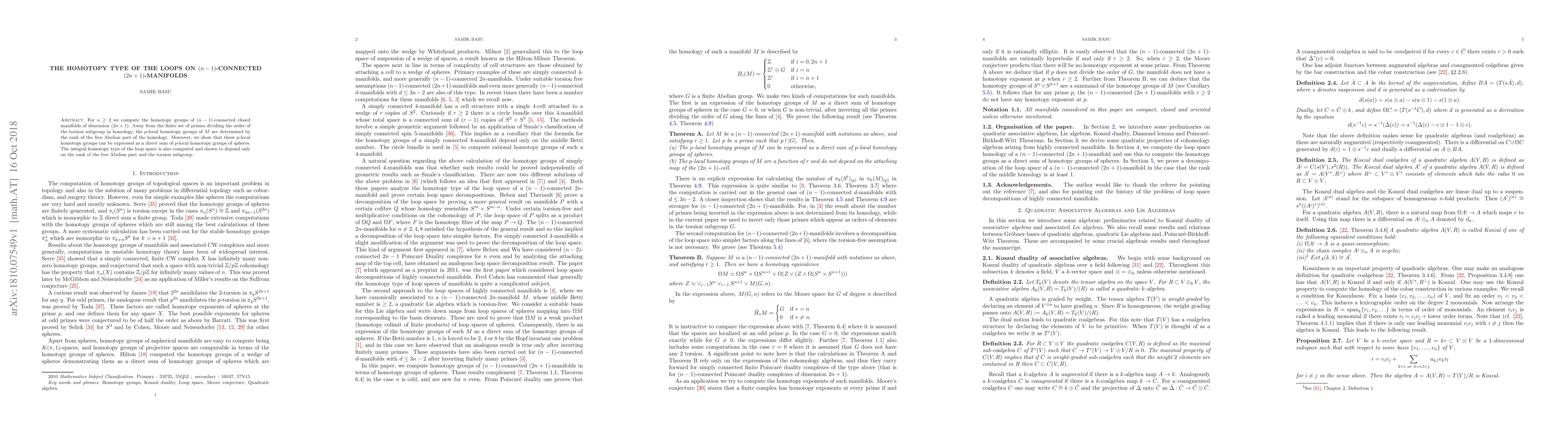 This paper computes the homotopy groups of $(n-1)$-connected $(2n+1)$-manifolds, showing that away from certain primes, their $p$-local homotopy groups depend on the rank of the free Abelian part of homology. The integral homotopy type of the loop space is determined by the rank of the free Abelian part and the torsion subgroup.