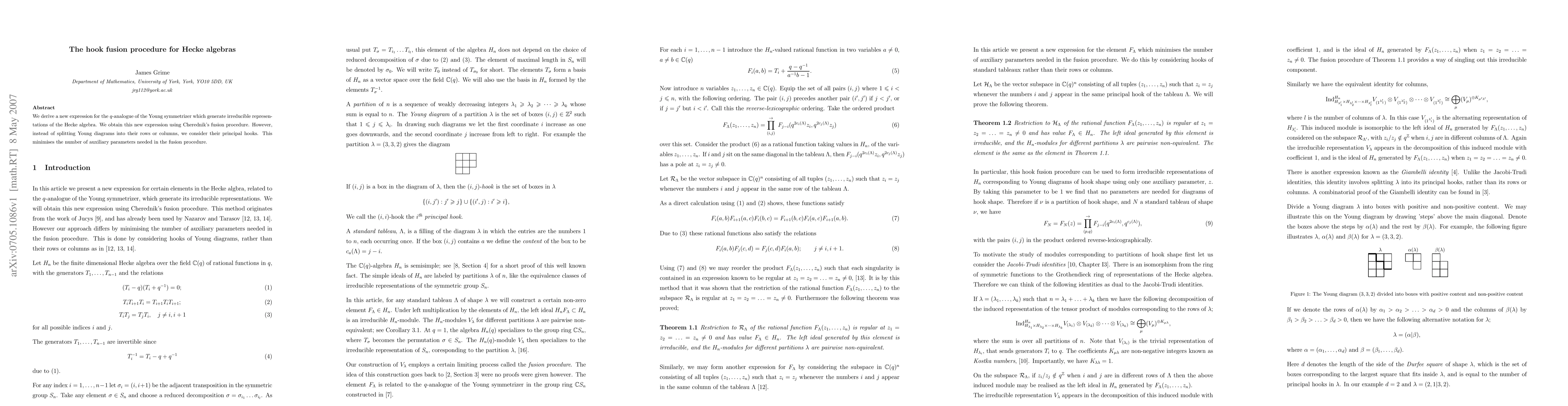 We derive a new expression for the q-analogue of the Young symmetrizer which generate irreducible representations of the Hecke algebra. We obtain this new expression using Cherednik's fusion procedure. However, instead of splitting Young diagrams into their rows or columns, we consider their principal hooks. This minimises the number of auxiliary parameters needed in the fusion procedure.