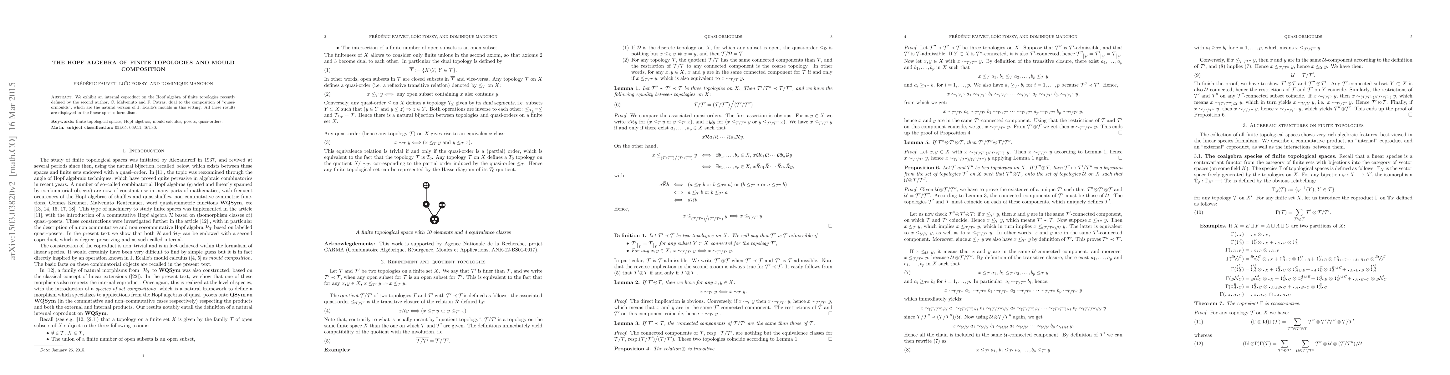 This paper introduces an internal coproduct on the Hopf algebra of finite topologies, dual to the composition of quasi-ormoulds, and presents these results within the framework of linear species. The study extends J. Ecalle's mould theory to finite topological spaces.
