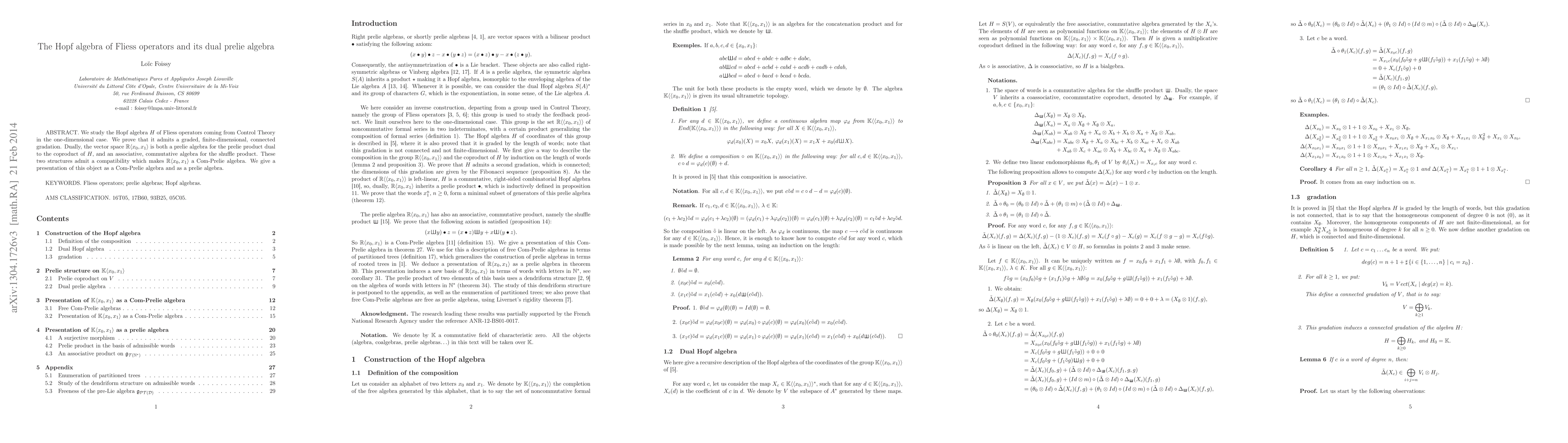 This paper investigates the Hopf algebra H of Fliess operators in Control Theory, proving its graded, finite-dimensional, and connected gradation. It also demonstrates that the dual vector space IR forms a Com-pre-Lie algebra, combining pre-Lie and associative, commutative algebra structures through a compatible shuffle product.