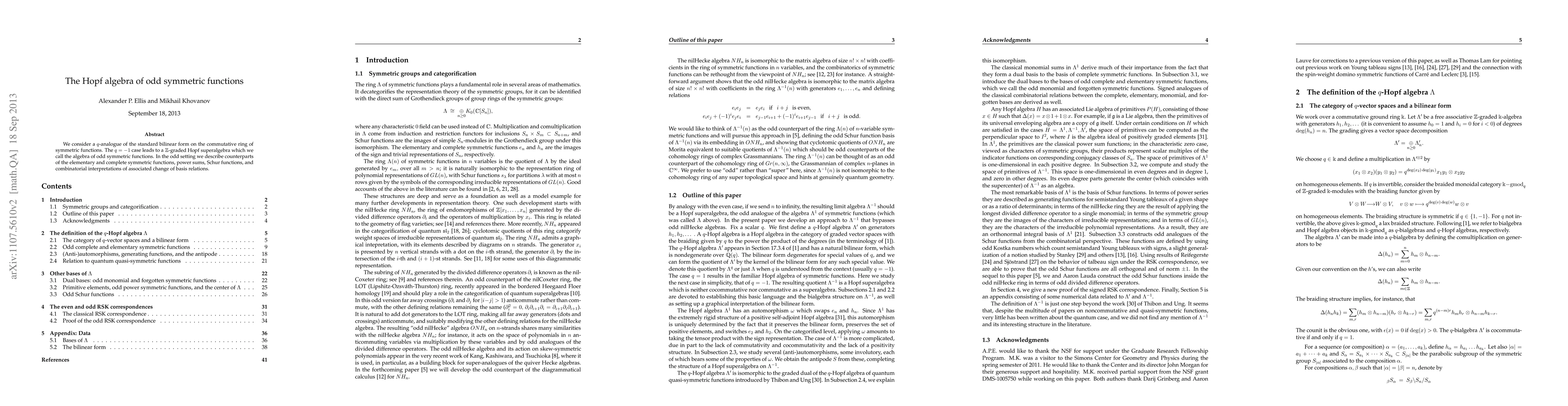 This paper explores the Hopf algebra of odd symmetric functions, a Z-graded Hopf superalgebra derived from a q-analogue of the standard bilinear form on symmetric functions when q=-1. It discusses analogues of various symmetric functions and their combinatorial interpretations.