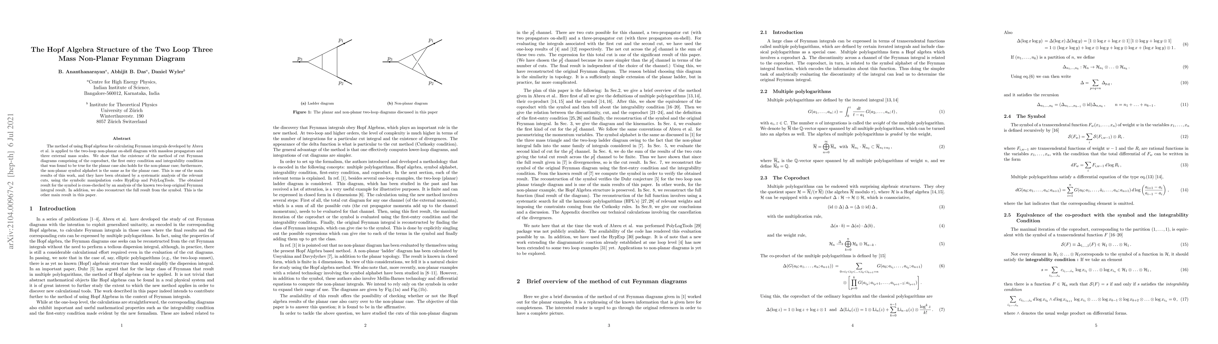 The method of using Hopf algebras for calculating Feynman integrals developed by Abreu et al. is applied to the two-loop non-planar on-shell diagram with massless propagators and three external mass scales. We show that the existence of the method of cut Feynman diagrams comprising of the coproduct, the first entry condition and integrability condition that was found to be true for the planar case also holds for the non-planar case; furthermore, the non-planar symbol alphabet is the same as for the planar case. This is one of the main results of this work, and they have been obtained by a systematic analysis of the relevant cuts, using the symbolic manipulation codes HypExp and PolyLogTools. The obtained result for the symbol is cross-checked by an analysis of the known two-loop original Feynman integral result. In addition, we also reconstruct the full result from the symbol. This is the other main result in this paper.