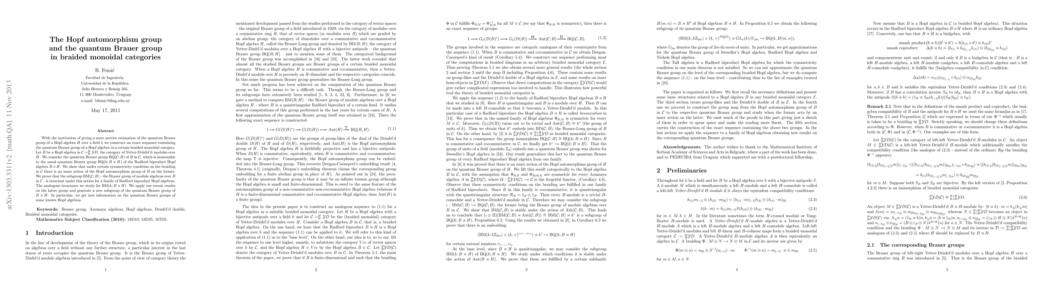 With the motivation of giving a more precise estimation of the quantum Brauer group of a Hopf algebra $H$ over a field $k$ we construct an exact sequence containing the quantum Brauer group of a Hopf algebra in a certain braided monoidal category. Let $B$ be a Hopf algebra in $\C=_H ^H\YD$, the category of Yetter-Drinfel'd modules over $H$. We consider the quantum Brauer group $\BQ(\C; B)$ of $B$ in $\C$, which is isomorphic to the usual quantum Brauer group $\BQ(k; B\rtimes H)$ of the Radford biproduct Hopf algebra $B\rtimes H$. We show that under certain symmetricity condition on the braiding in $\C$ there is an inner action of the Hopf automorphism group of $B$ on the former. We prove that the subgroup $\BM(\C; B)$ - the Brauer group of module algebras over $B$ in $\C$ - is invariant under this action for a family of Radford biproduct Hopf algebras. The analogous invariance we study for $\BM(k; B\rtimes H)$. We apply our recent results on the latter group and generate a new subgroup of the quantum Brauer group of $B\rtimes H$. In particular, we get new information on the quantum Brauer groups of some known Hopf algebras.
