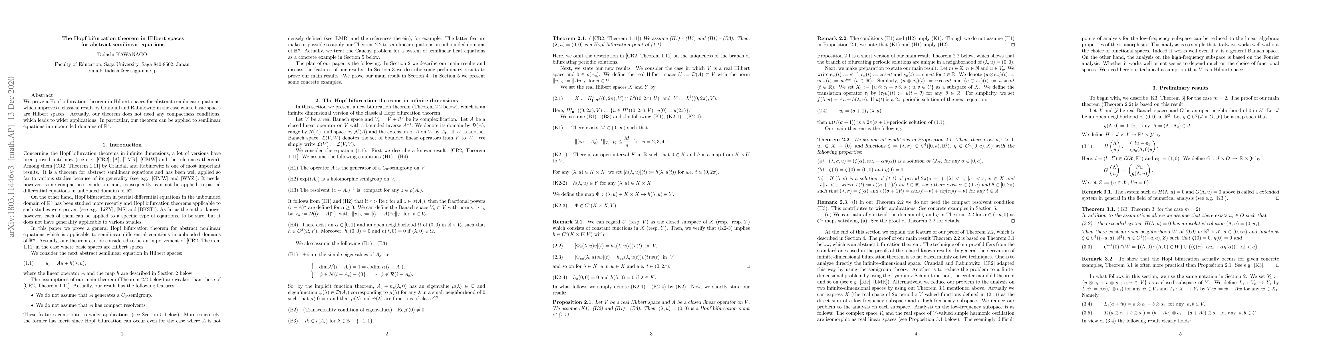 This paper proves a Hopf bifurcation theorem in Hilbert spaces for abstract semilinear equations, improving upon Crandall and Rabinowitz's classical result by eliminating compactness conditions, thus extending applicability to semilinear equations in unbounded domains of $\mathbb{R}^n$.