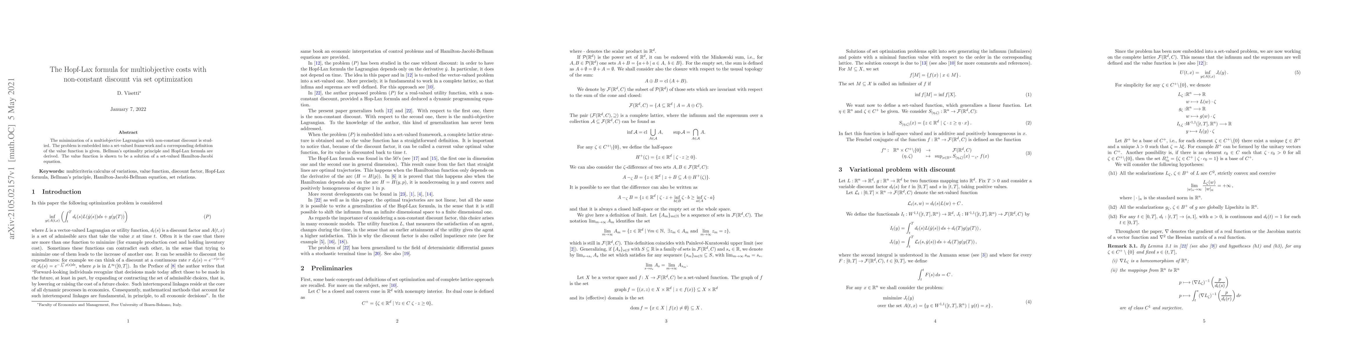 The minimization of a multiobjective Lagrangian with non-constant discount is studied. The problem is embedded into a set-valued framework and a corresponding definition of the value function is given. Bellman's optimality principle and Hopf-Lax formula are derived. The value function is shown to be a solution of a set-valued Hamilton-Jacobi equation.
