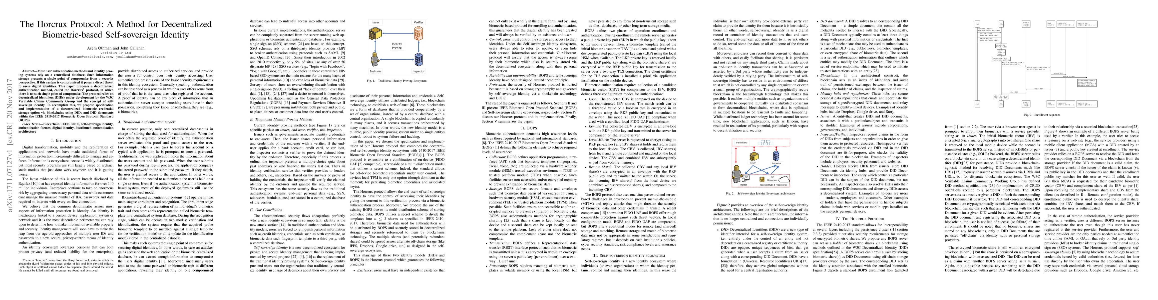 Most user authentication methods and identity proving systems rely on a centralized database. Such information storage presents a single point of compromise from a security perspective. If this system is compromised it poses a direct threat to users' digital identities. This paper proposes a decentralized authentication method, called the Horcrux protocol, in which there is no such single point of compromise. The protocol relies on decentralized identifiers (DIDs) under development by the W3C Verifiable Claims Community Group and the concept of self-sovereign identity. To accomplish this, we propose specification and implementation of a decentralized biometric credential storage option via blockchains using DIDs and DID documents within the IEEE 2410-2017 Biometric Open Protocol Standard (BOPS).