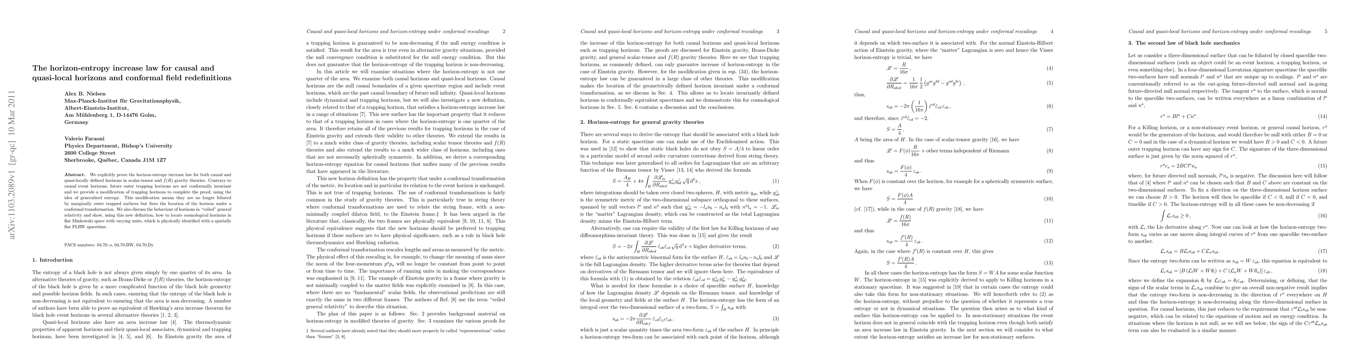 The paper proves the horizon-entropy increase law for causal and quasi-local horizons in scalar-tensor and $f(R)$ gravity, showing that future outer trapping horizons require a modification to maintain their location under conformal transformations. This modified definition addresses cosmological horizons in flat Minkowski space, corresponding to a spatially flat FLRW spacetime.