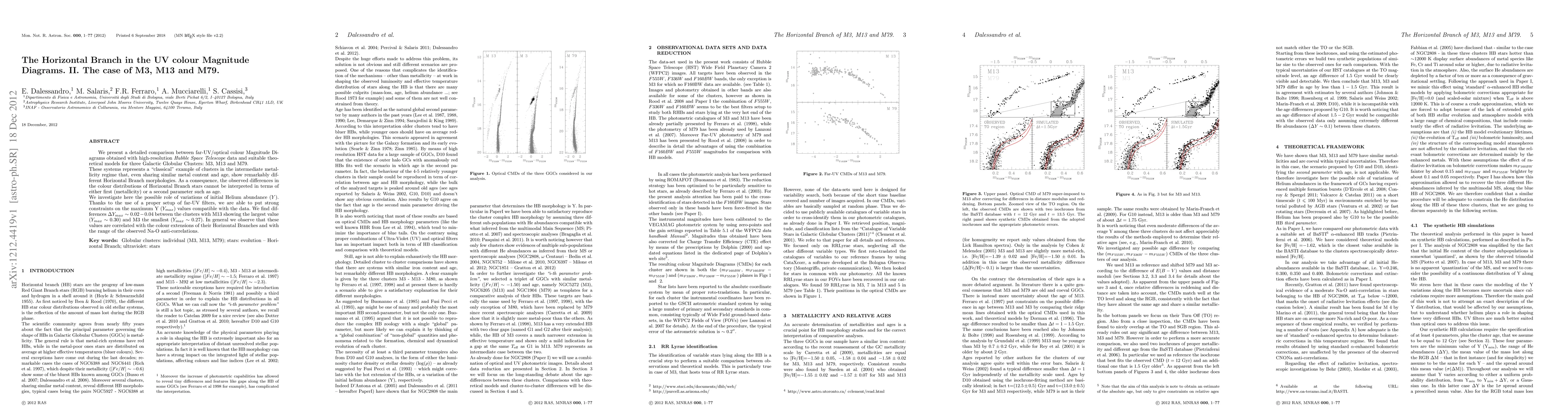 This paper compares far-UV/optical colour magnitude diagrams of three globular clusters (M3, M13, and M79) using Hubble Space Telescope data, revealing differences in Horizontal Branch morphologies despite similar metal content and age. The study suggests that variations in initial Helium abundance (Y) may explain these differences, finding a range of Y_{max} values correlated with Horizontal Branch colour extensions and Na-O anti-correlations.