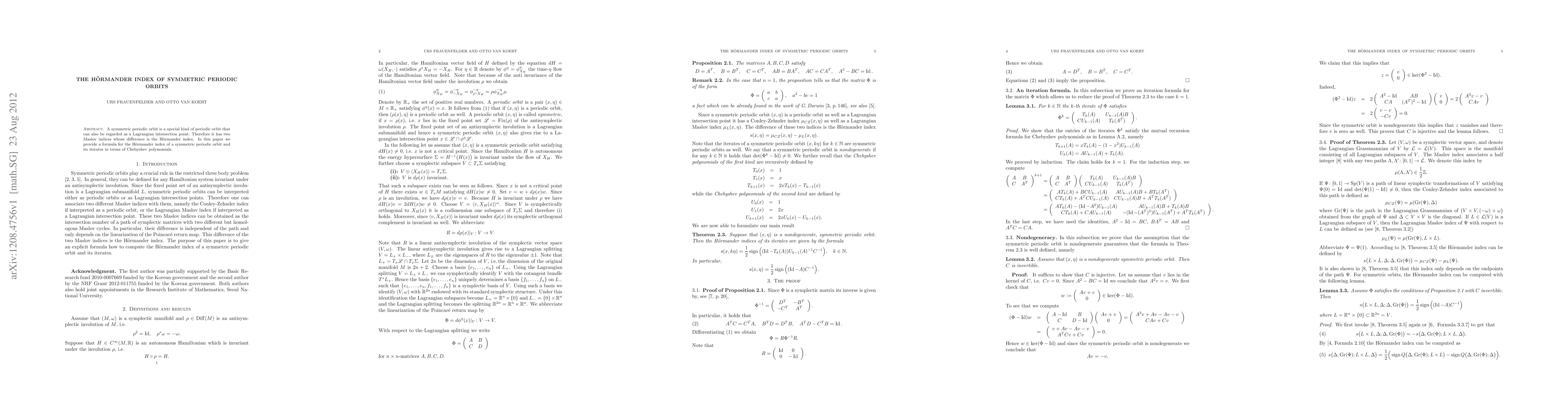 This paper derives a formula for the Hormander index of symmetric periodic orbits in terms of Chebyshev polynomials, relating it to the difference of two Maslov indices. The focus is on providing a mathematical expression for these special periodic orbits, which are also viewed as Lagrangian intersection points.