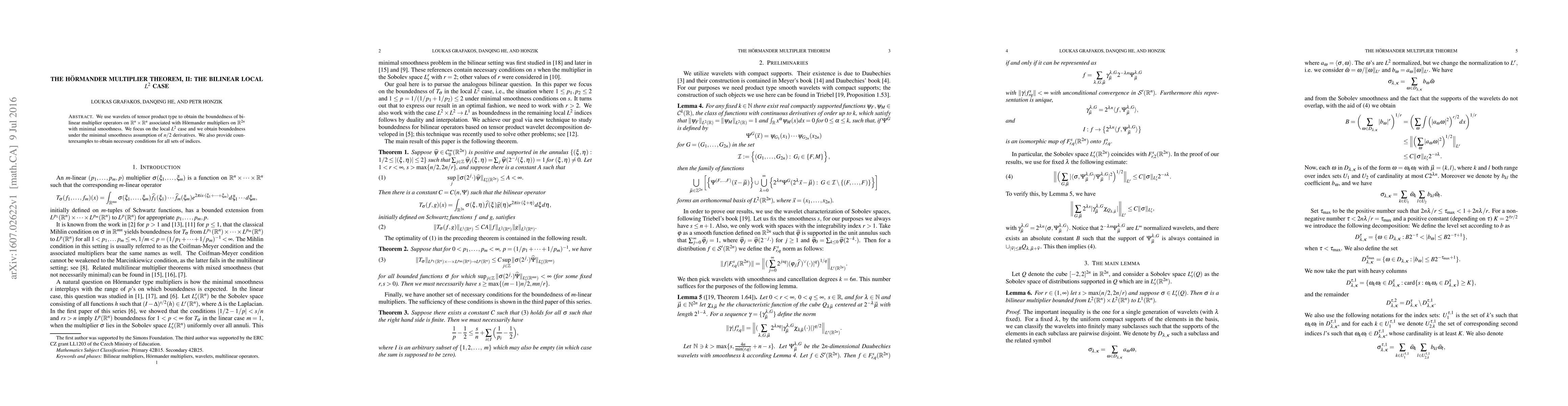 This paper establishes the boundedness of bilinear multiplier operators on $\mathbb R^n\times \mathbb R^n$ using tensor product wavelets, focusing on the local $L^2$ case with minimal smoothness of $n/2$ derivatives. It also presents counterexamples to highlight necessary conditions for these operators.