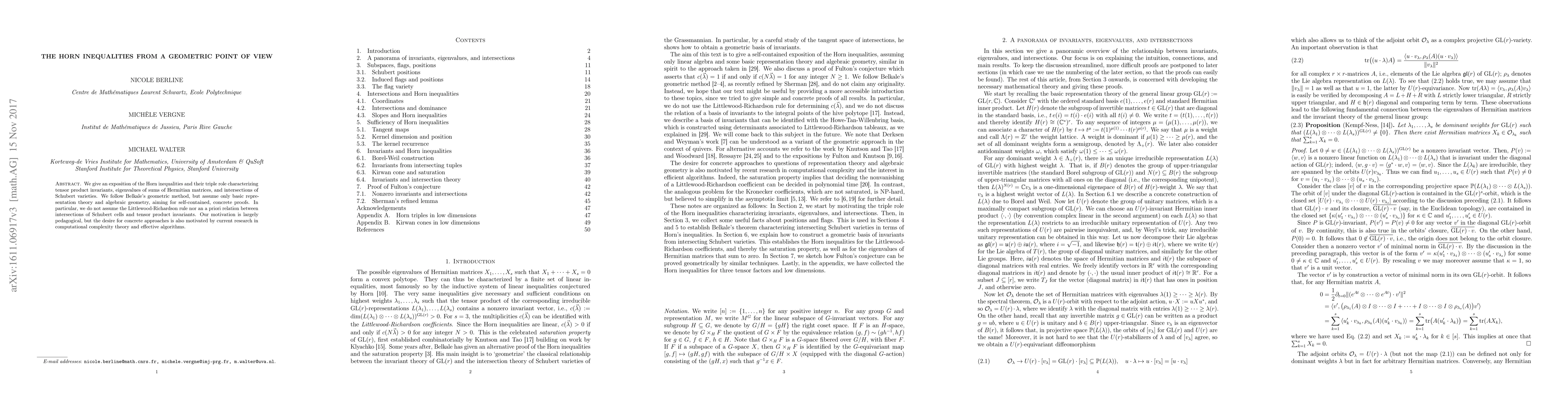 We give an exposition of the Horn inequalities and their triple role characterizing tensor product invariants, eigenvalues of sums of Hermitian matrices, and intersections of Schubert varieties. We follow Belkale's geometric method, but assume only basic representation theory and algebraic geometry, aiming for self-contained, concrete proofs. In particular, we do not assume the Littlewood-Richardson rule nor an a priori relation between intersections of Schubert cells and tensor product invariants. Our motivation is largely pedagogical, but the desire for concrete approaches is also motivated by current research in computational complexity theory and effective algorithms.