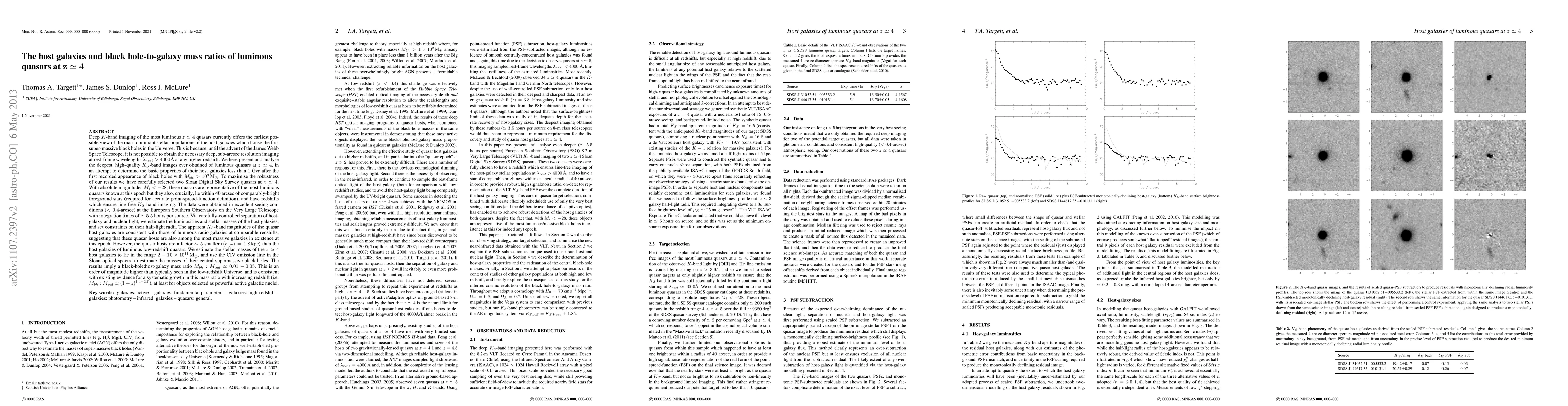This study analyzes high-quality Ks-band images of two luminous quasars at z~4 to determine the properties of their host galaxies and black-hole mass ratios. The findings suggest that quasar hosts are among the most massive galaxies at this epoch, with stellar masses ranging from 2-10x10^11 Msol, and a black-hole:host-galaxy mass ratio of Mbh:Mgal~0.01-0.05, significantly higher than in low-redshift quasars.