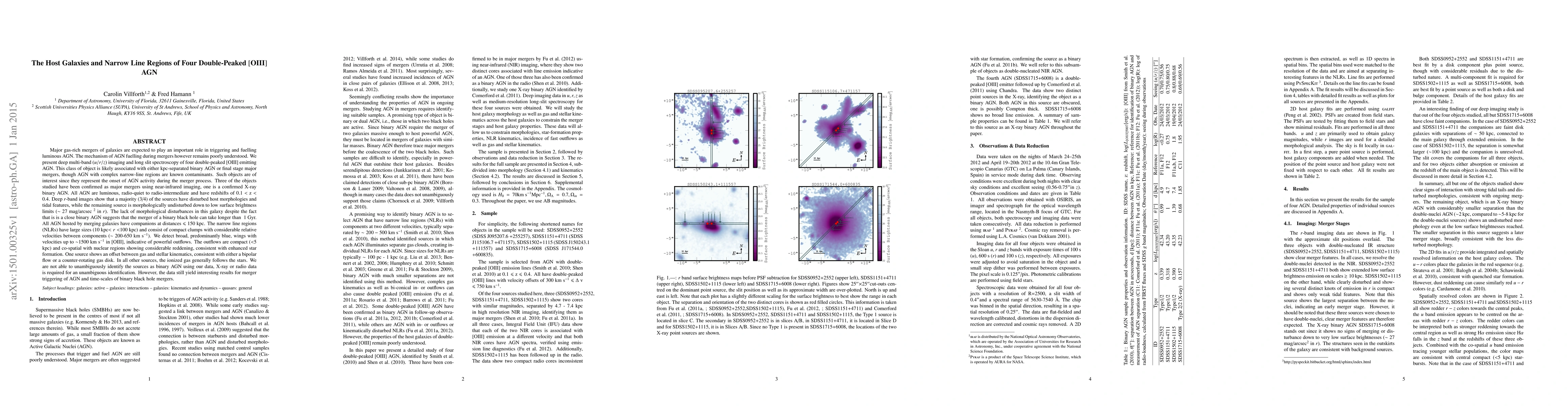 This paper investigates four double-peaked [OIII] AGN, revealing that three are major mergers and one is a confirmed X-ray binary AGN. The study finds disturbed host morphologies and large, compact narrow-line regions with powerful outflows, suggesting significant merger-induced AGN activity and variable timescales for binary black hole mergers.