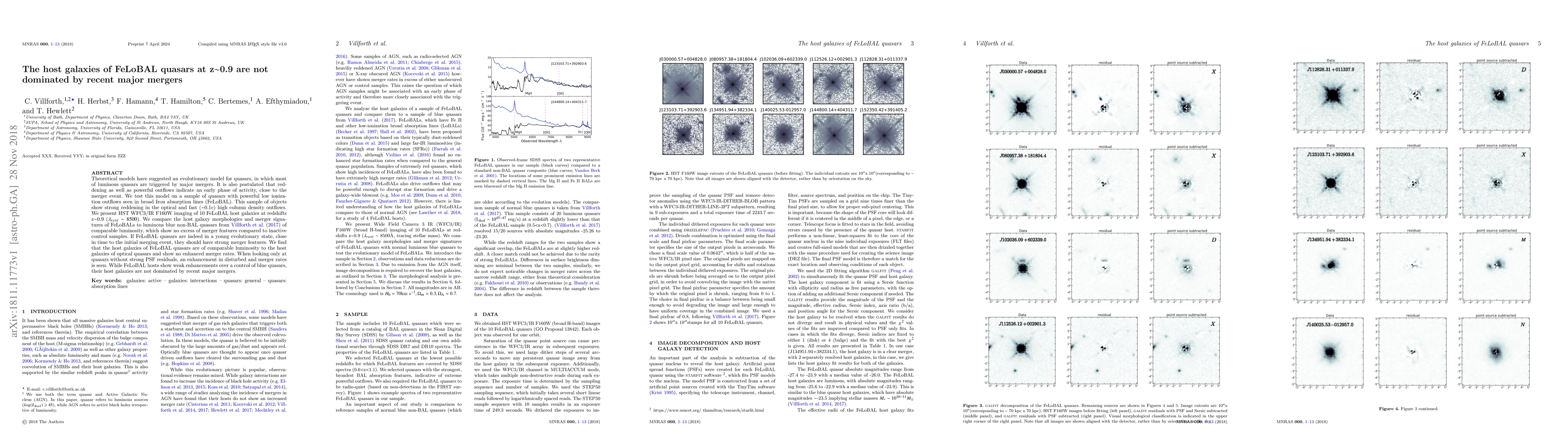 Theoretical models have suggested an evolutionary model for quasars, in which most of luminous quasars are triggered by major mergers. It is also postulated that reddening as well as powerful outflows indicate an early phase of activity, close to the merger event. We test this model on a sample of quasars with powerful low ionization outflows seen in broad Iron absorption lines (FeLoBAL). This sample of objects show strong reddening in the optical and fast ($\sim$0.1c) high column density outflows. We present HST WFC3/IR F160W imaging of 10 FeLoBAL host galaxies at redshifts z$\sim$0.9 ($\lambda_{rest}\sim8500\AA$). We compare the host galaxy morphologies and merger signatures of FeLoBALs to luminous blue non-BAL quasars from Villforth et al. 2017 of comparable luminosity, which show no excess of merger features compared to inactive control samples. If FeLoBAL quasars are indeed in a young evolutionary state, close in time to the initial merging event, they should have strong merger features. We find that the host galaxies of FeLoBAL quasars are of comparable luminosity to the host galaxies of optical quasars and show no enhanced merger rates. When looking only at quasars without strong PSF residuals, an enhancement in disturbed and merger rates is seen. While FeLoBAL hosts show weak enhancements over a control of blue quasars, their host galaxies are not dominated by recent major mergers.