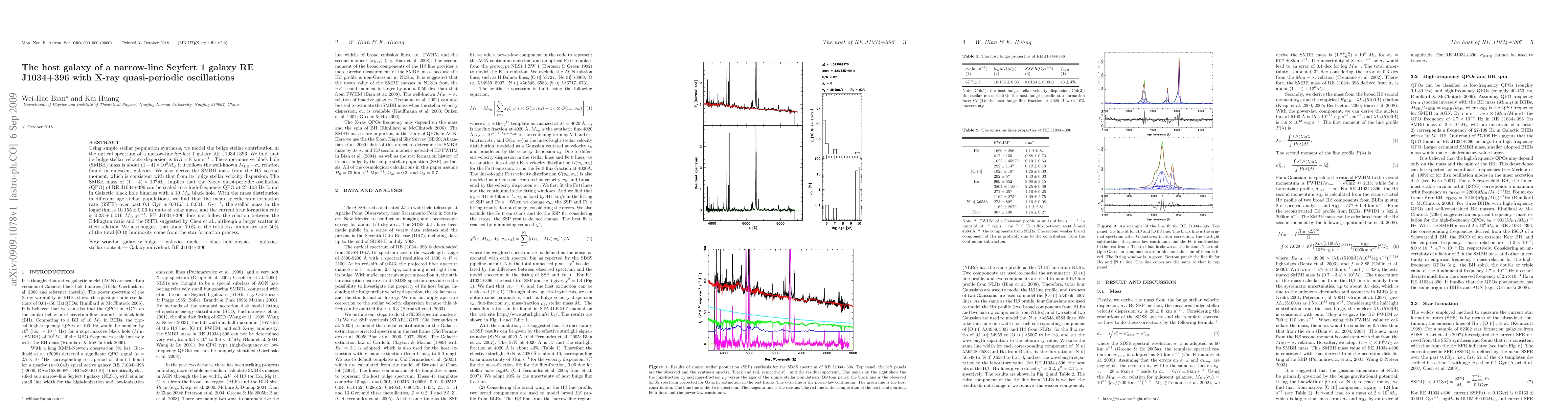 Researchers studied a narrow-line Seyfert 1 galaxy RE J1034+396 and found that its supermassive black hole has a mass of $1-4 imes 10^6$ solar masses, similar to those in quiescent galaxies. The study also revealed the galaxy's star formation rate and provided insights into the properties of its X-ray quasi-periodic oscillations.
