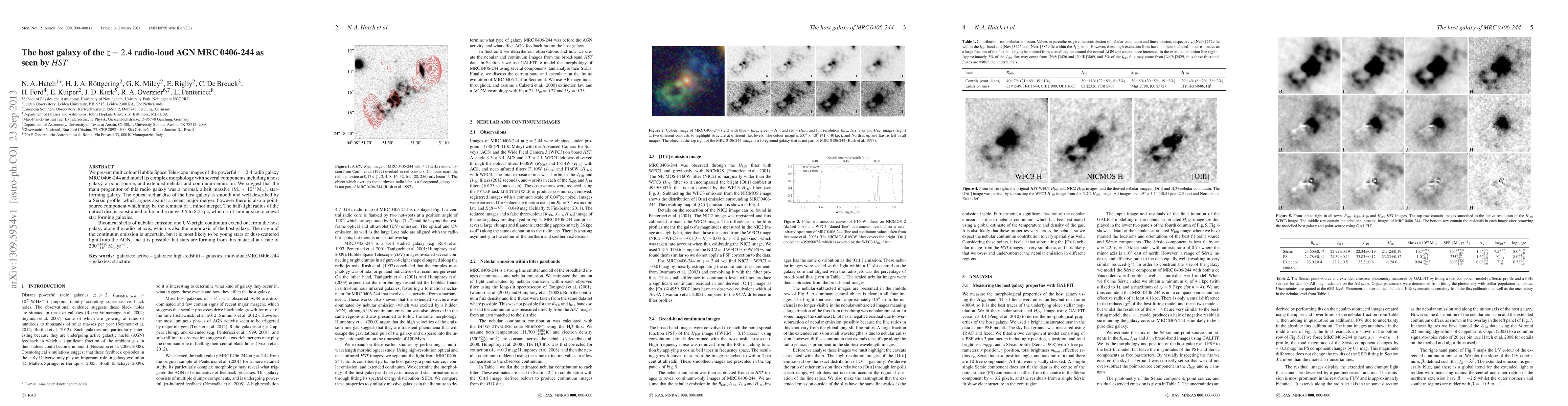 This paper uses Hubble Space Telescope images to analyze the complex morphology of the z=2.4 radio galaxy MRC 0406-244, suggesting it originated from a massive, normal star-forming galaxy. The host galaxy's smooth optical disc indicates a lack of recent major mergers, while the presence of a point-source hints at a minor merger.