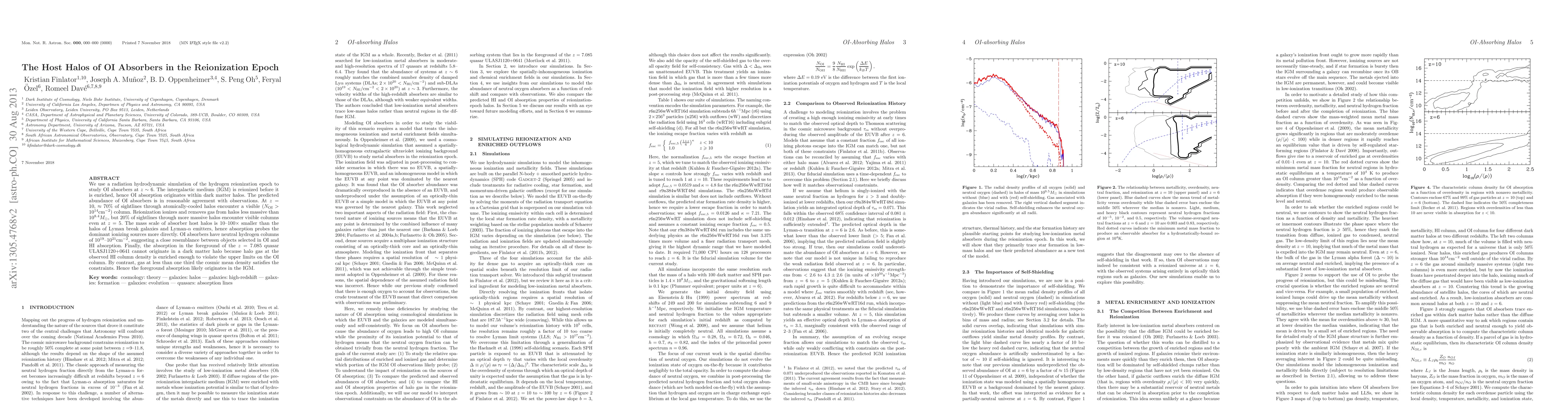 We use a radiation hydrodynamic simulation of the hydrogen reionization epoch to study OI absorbers at z~6. The intergalactic medium (IGM) is reionized before it is enriched, hence OI absorption originates within dark matter halos. The predicted abundance of OI absorbers is in reasonable agreement with observations. At z=10, roughly 70% of sightlines through atomically-cooled halos encounter a visible (N_OI > 10^14 cm^-2) column. Reionization ionizes and removes gas from halos less massive than 10^8.4 M_0, but 20% of sightlines through more massive halos encounter visible columns even at z=5. The mass scale of absorber host halos is 10-100 times smaller than the halos of Lyman break galaxies and Lyman-alpha emitters, hence absorption probes the dominant ionizing sources more directly. OI absorbers have neutral hydrogen columns of 10^19-10^21 cm^-2, suggesting a close resemblance between objects selected in OI and HI absorption. Finally, the absorption in the foreground of the z=7.085 quasar ULASJ1120+0641 cannot originate in a dark matter halo because halo gas at the observed HI column density is enriched enough to violate the upper limits on the OI column. By contrast, gas at less than one third the cosmic mean density satisfies the constraints. Hence the foreground absorption likely originates in the IGM.