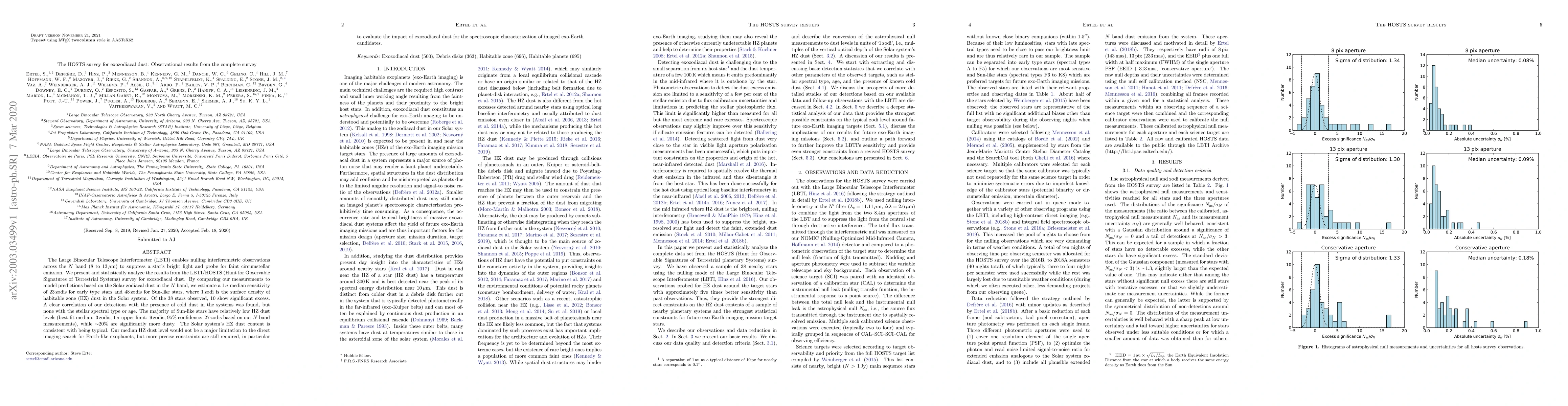 The HOSTS survey detected exozodiacal dust in 10 out of 38 observed stars, with a median sensitivity limit of 23-48 zodis for early-type and Sun-like stars, respectively, indicating that most Sun-like stars have relatively low habitable zone dust levels.