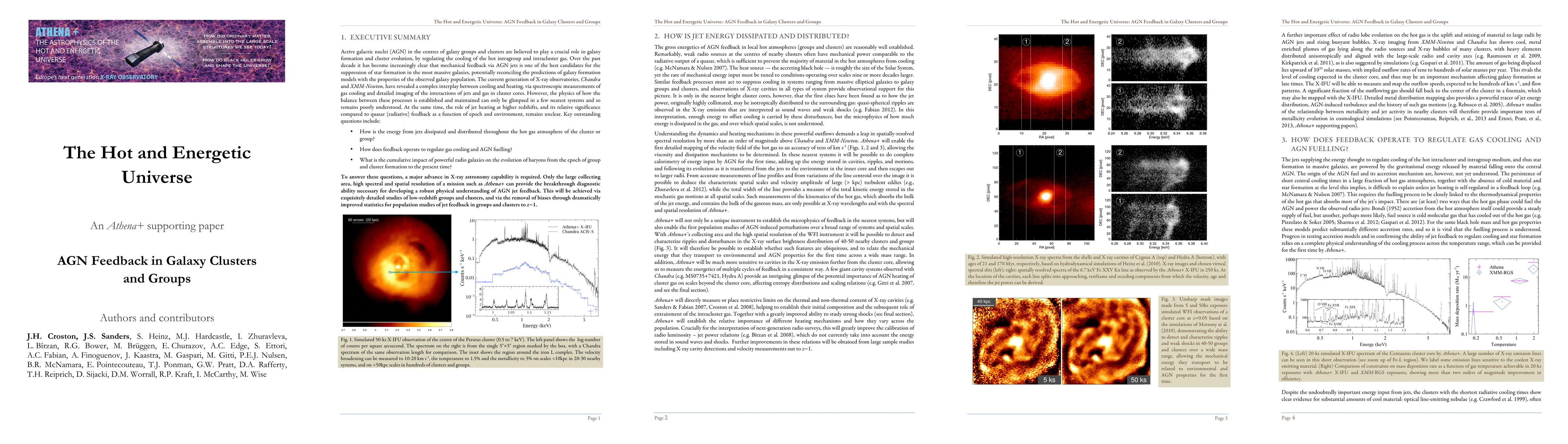This paper discusses the importance of AGN feedback in galaxy clusters and groups, emphasizing the need for better understanding of how AGN jets regulate gas cooling and star formation. The Athena+ observatory is expected to provide crucial insights through detailed kinematic and thermodynamic mapping of the hot gas affected by AGN jets, thereby clarifying the energy dissipation and feedback mechanisms in these environments.