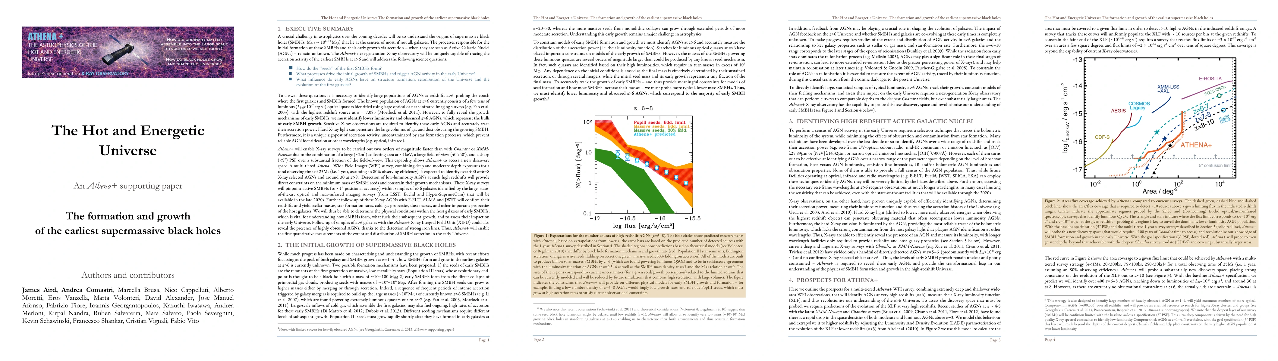 A crucial challenge in astrophysics over the coming decades will be to understand the origins of supermassive black holes (SMBHs) that lie at the centres of most, if not all, galaxies. The processes responsible for the initial formation of these SMBHs and their early growth via accretion - when they are seen as Active Galactic Nuclei (AGN) - remain unknown. To address this challenge, we must identify low luminosity and obscured z>6 AGNs, which represent the bulk of early SMBH growth. Sensitive X-ray observations are a unique signpost of accretion activity, uncontaminated by star formation processes, which prevent reliable AGN identification at other wavelengths (e.g. optical, infrared). The Athena+ Wide Field Imager will enable X-ray surveys to be carried out two orders of magnitude faster than with Chandra or XMM-Newton, opening a new discovery space and identifying over 400 z>6 AGN, including obscured sources. Athena+ will also play a fundamental role to enhance the scientific return of future multiwavelength facilities that will probe the physical conditions within the host galaxies of early SMBHs, which is vital for understanding how SMBHs form, what fuels their subsequent growth, and to assess their impact on the early Universe. Follow-up of samples of z>6 galaxies with the Athena+ X-ray Integral Field Unit could also reveal the presence of highly obscured AGNs, thanks to the detection of strong iron lines. Thus, Athena+ will enable the first quantitative measurements of the extent and distribution of SMBH accretion in the early Universe.