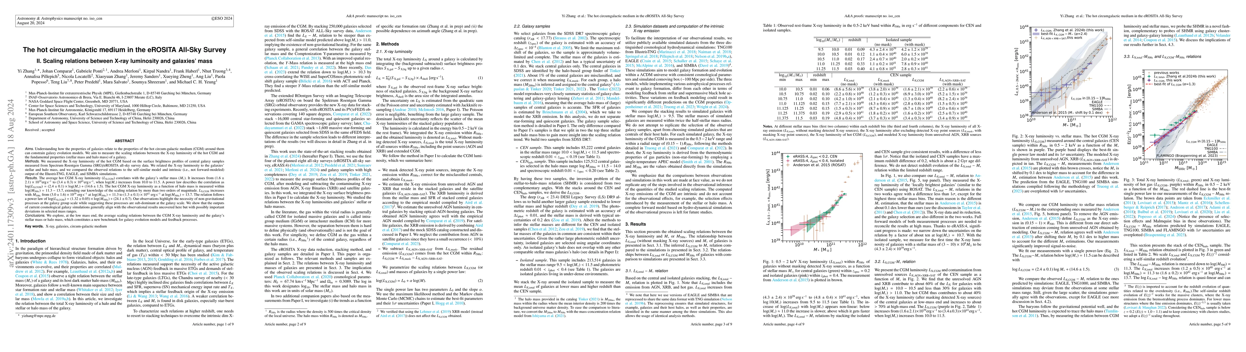 This study investigates the scaling relations between the X-ray luminosity of the hot circum-galactic medium (CGM) and galaxies' stellar and halo mass using eROSITA all-sky survey data. The X-ray luminosity correlates with stellar mass, showing a double power law relation with a break at $\log(M_*)=11.28$, and scales with halo mass as $\log(L_{\rm X,CGM}) = (1.35\pm 0.04)\times \log(M_{\rm 500c})+(23.8\pm0.5)$. The findings provide new benchmarks for galaxy evolution models.