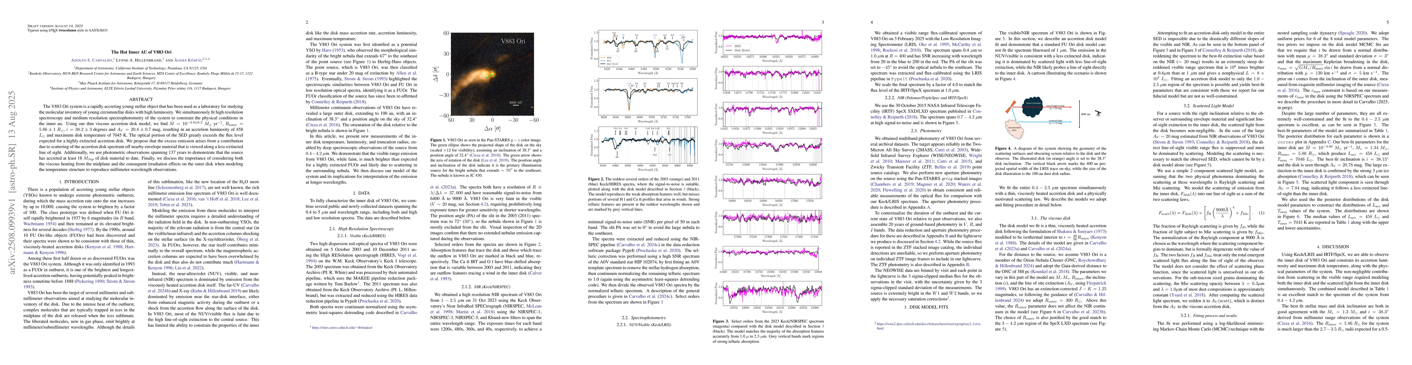 The V883 Ori system is a rapidly accreting young stellar object that has been used as a laboratory for studying the molecular inventory of young circumstellar disks with high luminosity. We simultaneously fit high resolution spectroscopy and medium resolution spectrophotometry of the system to constrain the physical conditions in the inner au. Using our thin viscous accretion disk model, we find $\dot{M} = 10^{-3.9 \pm 0.2} \ M_\odot$ yr$^{-1}$, $R_\mathrm{inner} = 5.86 \pm 1 \ R_\odot$, $i = 38.2 \pm 3$ degrees and $A_V = 20.8 \pm 0.7$ mag, resulting in an accretion luminosity of 458 $L_\odot$ and maximum disk temperature of 7045 K. The optical portion of the SED greatly exceeds the flux level expected for a highly extincted accretion disk. We propose that the excess emission arises from a contribution due to scattering of the accretion disk spectrum off nearby envelope material that is viewed along a less-extincted line of sight. Additionally, we use photometric observations spanning 137 years to demonstrate that the source has accreted at least 18 $M_\mathrm{Jup}$ of disk material to date. Finally, we discuss the importance of considering both the viscous heating from the midplane and the consequent irradiation effects on the outer disk when modeling the temperature structure to reproduce millimeter-wavelength observations.