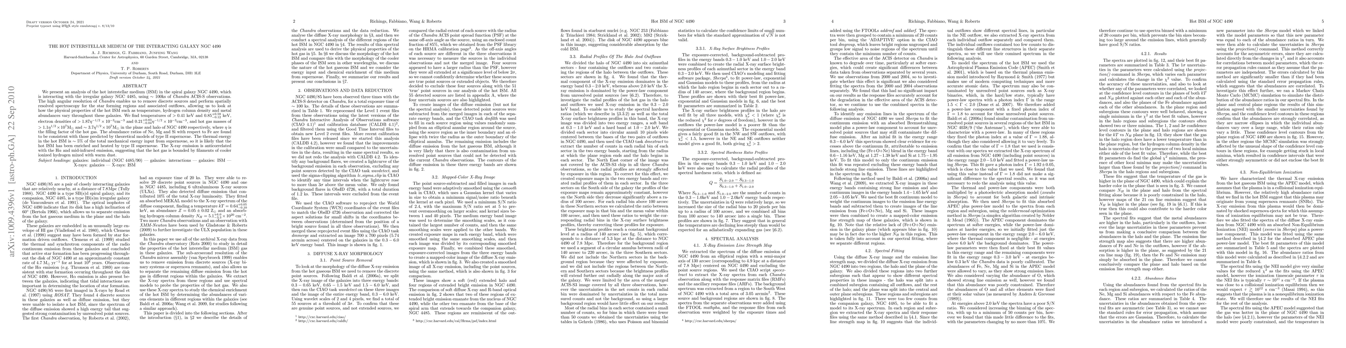 We present an analysis of the hot interstellar medium (ISM) in the spiral galaxy NGC 4490, which is interacting with the irregular galaxy NGC 4485, using ~100ks of Chandra ACIS-S observations. The high angular resolution of Chandra enables us to remove discrete sources and perform spatially resolved spectroscopy for the star forming regions and associated outflows, allowing us to look at how the physical properties of the hot ISM such as temperature, hydrogen column density and metal abundances vary throughout these galaxies. We find temperatures of >0.41 keV and 0.85 +0.59/-0.12 keV, electron densities of >1.87 eta^(-1/2) x 10^(-3) cm^(-3) and 0.21 +0.03/-0.04 eta^(-1/2) x 10^(-3) cm^(-3), and hot gas masses of >1.1 eta^(1/2) x 10^7 M_{\odot} and ~3.7 eta^(1/2) x 10^7 M_{\odot} in the plane and halo of NGC 4490 respectively, where eta is the filling factor of the hot gas. The abundance ratios of Ne, Mg and Si with respect to Fe are found to be consistent with those predicted by theoretical models of type II supernovae. The thermal energy in the hot ISM is ~5% of the total mechanical energy input from supernovae, so it is likely that the hot ISM has been enriched and heated by type II supernovae. The X-ray emission is anticorrelated with the H-alpha and mid-infrared emission, suggesting that the hot gas is bounded by filaments of cooler ionized hydrogen mixed with warm dust.