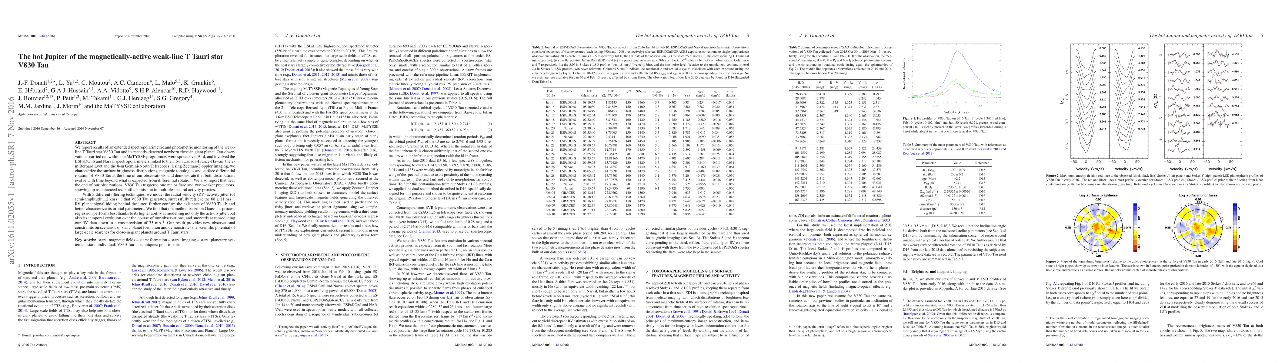 We report results of an extended spectropolarimetric and photometric monitoring of the weak-line T Tauri star V830 Tau and its recently-detected newborn close-in giant planet. Our observations, carried out within the MaTYSSE programme, were spread over 91d, and involved the ESPaDOnS and Narval spectropolarimeters linked to the 3.6m Canada-France-Hawaii, the 2m Bernard Lyot and the 8-m Gemini-North Telescopes. Using Zeeman-Doppler Imaging, we characterize the surface brightness distributions, magnetic topologies and surface differential rotation of V830 Tau at the time of our observations, and demonstrate that both distributions evolve with time beyond what is expected from differential rotation. We also report that near the end of our observations, V830 Tau triggered one major flare and two weaker precursors, showing up as enhanced red-shifted emission in multiple spectral activity proxies. With 3 different filtering techniques, we model the radial velocity (RV) activity jitter (of semi-amplitude 1.2km/s) that V830 Tau generates, successfully retrieve the 68m/s RV planet signal hiding behind the jitter, further confirm the existence of V830 Tau b and better characterize its orbital parameters. We find that the method based on Gaussian-process regression performs best thanks to its higher ability at modelling not only the activity jitter, but also its temporal evolution over the course of our observations, and succeeds at reproducing our RV data down to a rms precision of 35m/s. Our result provides new observational constraints on scenarios of star / planet formation and demonstrates the scientific potential of large-scale searches for close-in giant planets around T Tauri stars.