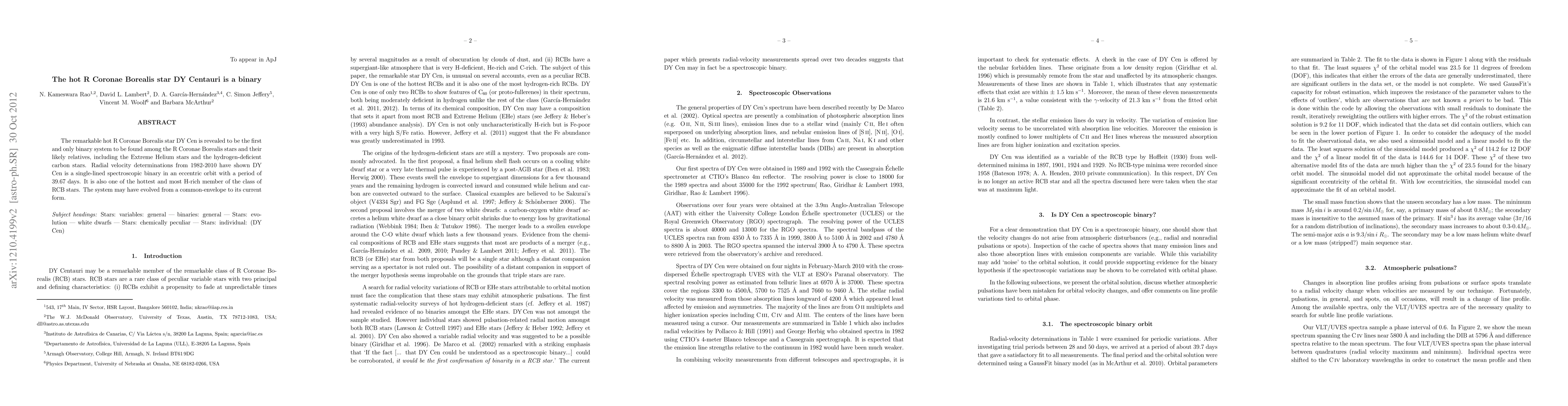 DY Centauri, a hot R Coronae Borealis star, is identified as the first binary system among RCB stars, with radial velocity data revealing it as a single-lined spectroscopic binary in an eccentric orbit with a 39.67-day period. This discovery suggests the system may have evolved from a common-envelope phase.