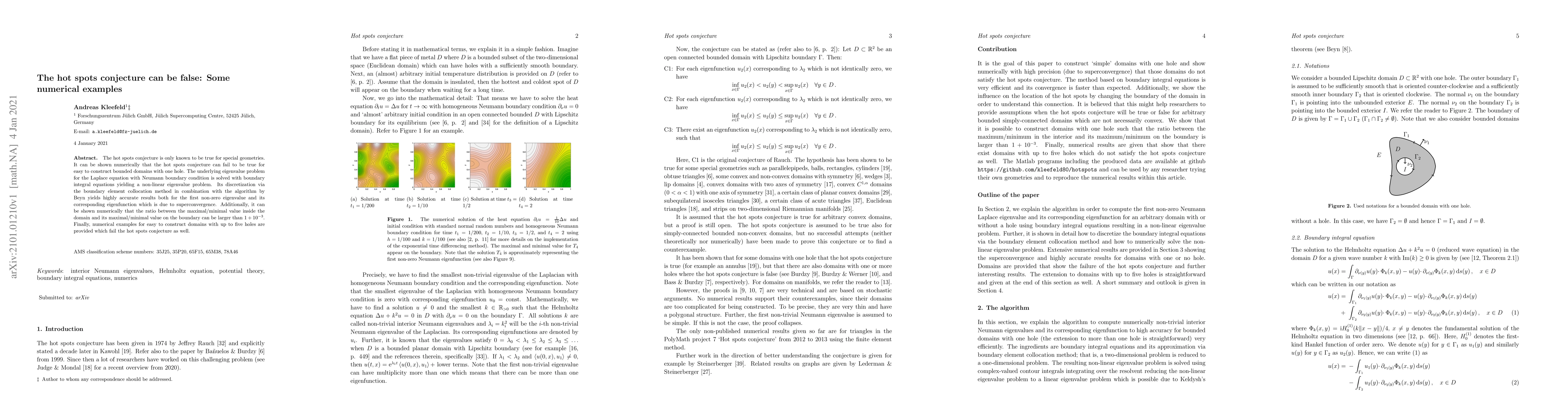 The hot spots conjecture is only known to be true for special geometries. It can be shown numerically that the hot spots conjecture can fail to be true for easy to construct bounded domains with one hole. The underlying eigenvalue problem for the Laplace equation with Neumann boundary condition is solved with boundary integral equations yielding a non-linear eigenvalue problem. Its discretization via the boundary element collocation method in combination with the algorithm by Beyn yields highly accurate results both for the first non-zero eigenvalue and its corresponding eigenfunction which is due to superconvergence. Additionally, it can be shown numerically that the ratio between the maximal/minimal value inside the domain and its maximal/minimal value on the boundary can be larger than $1+10^{-3}$. Finally, numerical examples for easy to construct domains with up to five holes are provided which fail the hot spots conjecture as well.