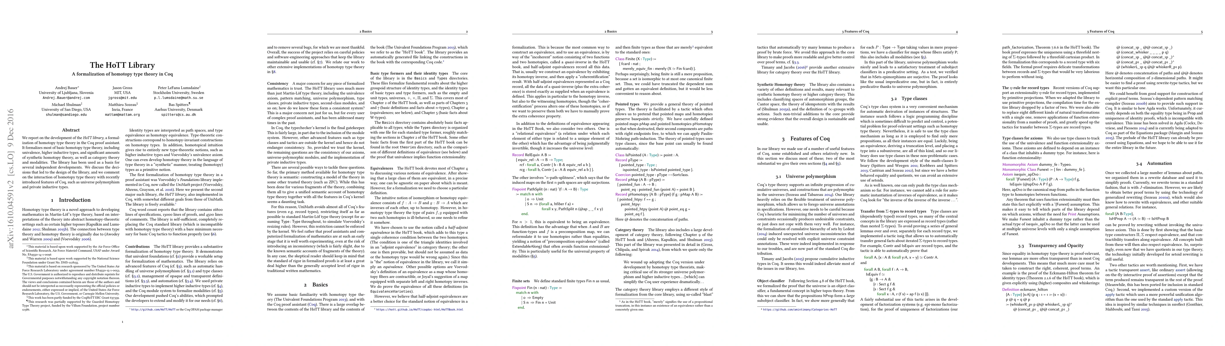 The HoTT library formalizes homotopy type theory in Coq, including univalence, higher inductive types, and synthetic homotopy theory, serving as a foundation for various independent developments. The design reflects the interaction between homotopy type theory and Coq's features like universe polymorphism.
