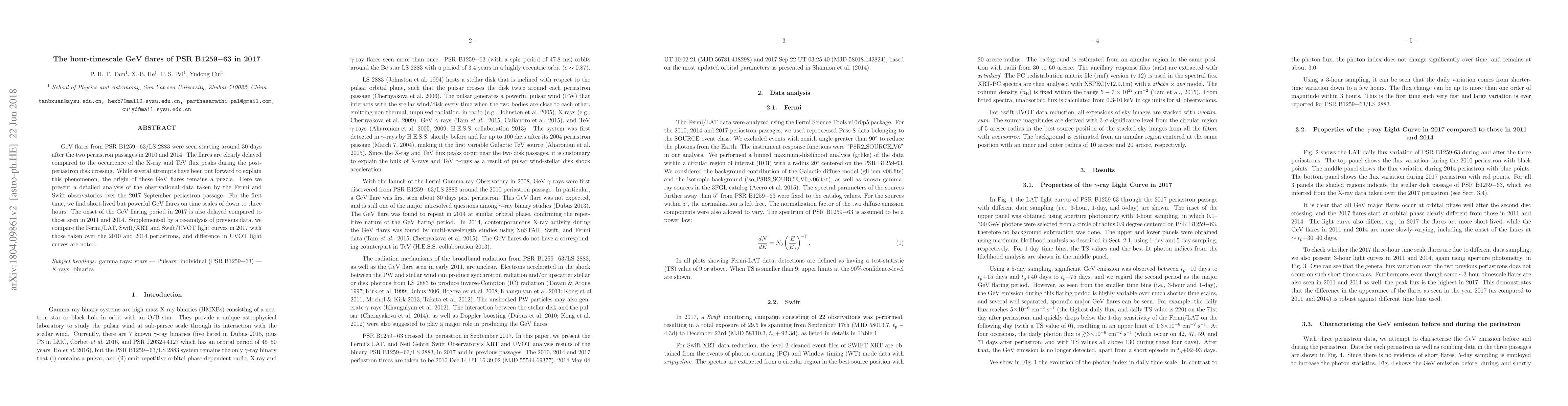 GeV flares from PSR B1259-63/LS 2883 were seen starting around 30 days after the two periastron passages in 2010 and 2014. The flares are clearly delayed compared to the occurrence of the X-ray and TeV flux peaks during the post-periastron disk crossing. While several attempts have been put forward to explain this phenomenon, the origin of these GeV flares remains a puzzle. Here we present a detailed analysis of the observational data taken by the Fermi and Swift observatories over the 2017 September periastron passage. For the first time, we find short-lived but powerful GeV flares on time scales of down to three hours. The onset of the GeV flaring period in 2017 is also delayed compared to those seen in 2011 and 2014. Supplemented by a re-analysis of previous data, we compare the Fermi/LAT, Swift/XRT and Swift/UVOT light curves in 2017 with those taken over the 2010 and 2014 periastrons, and difference in UVOT light curves are noted.