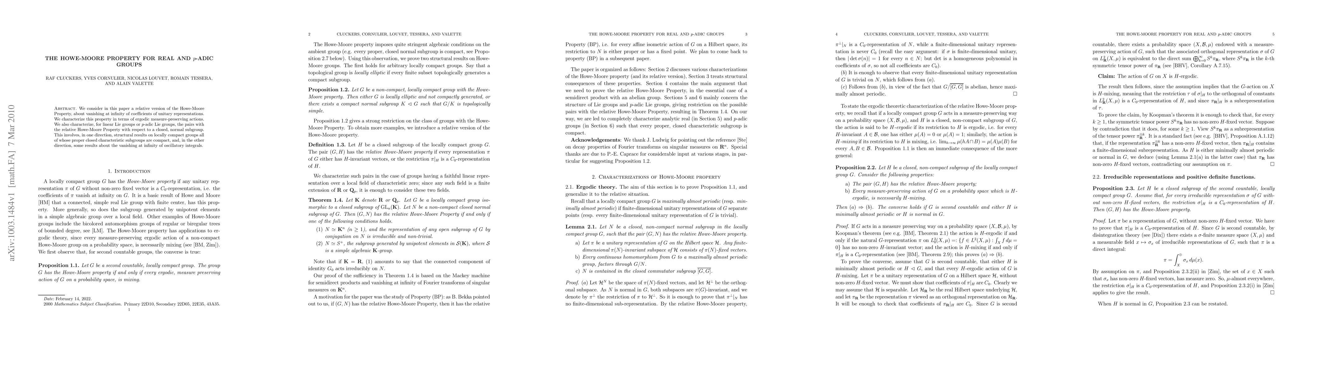 We consider in this paper a relative version of the Howe-Moore Property, about vanishing at infinity of coefficients of unitary representations. We characterize this property in terms of ergodic measure-preserving actions. We also characterize, for linear Lie groups or p-adic Lie groups, the pairs with the relative Howe-Moore Property with respect to a closed, normal subgroup. This involves, in one direction, structural results on locally compact groups all of whose proper closed characteristic subgroups are compact, and, in the other direction, some results about the vanishing at infinity of oscillatory integrals.