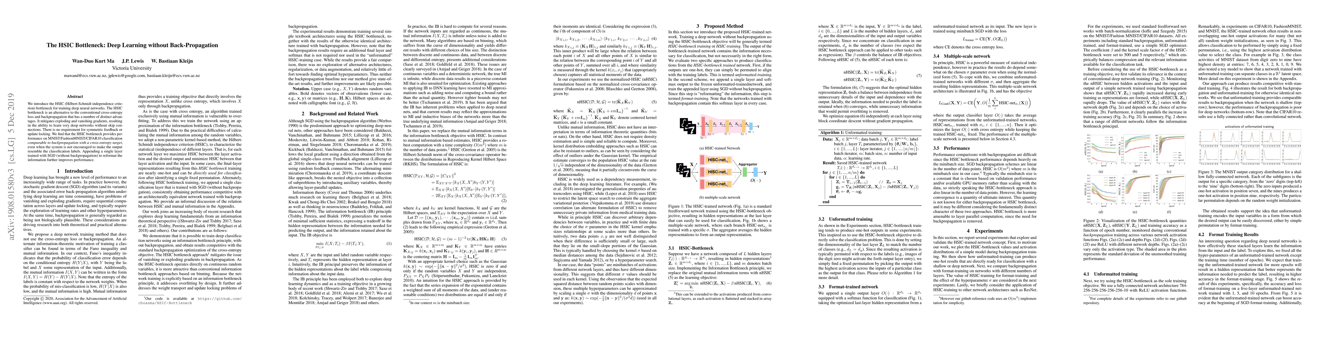 The HSIC bottleneck offers an alternative to backpropagation for training deep neural networks, effectively mitigating gradient issues and enabling deep learning without skip connections. It achieves comparable performance on classification tasks like MNIST and CIFAR10, and adding a single SGD layer further enhances results.