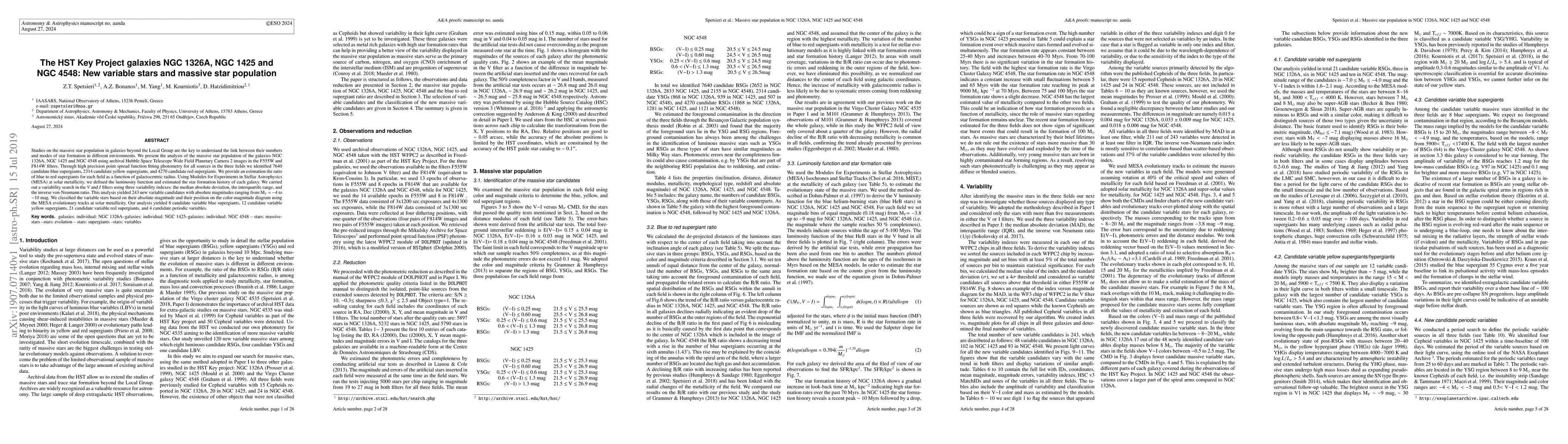 Studies on the massive star population in galaxies beyond the Local Group are the key to understand the link between their numbers and modes of star formation in different environments. We present the analysis of the massive star population of the galaxies NGC 1326A, NGC 1425 and NGC 4548 using archival Hubble Space Telescope Wide Field Planetary Camera 2 images in the F555W and F814W filters. Through high precision point spread function fitting photometry for all sources in the three fields we identified 7640 candidate blue supergiants, 2314 candidate yellow supergiants, and 4270 candidate red supergiants. We provide an estimation the ratio of blue to red supergiants for each field as a function of galactocentric radius. Using Modules for Experiments in Stellar Astrophysics (MESA) at solar metallicity, we defined the luminosity function and estimated the star formation history of each galaxy. We carried out a variability search in the V and I filters using three variability indexes: the median absolute deviation, the interquartile range, and the inverse von-Neumann ratio. This analysis yielded 243 new variable candidates with absolute magnitudes ranging from Mv= -4 to -10 mag. We classified the variable stars based on their absolute magnitude and their position on the color-magnitude diagram using the MESA evolutionary tracks at solar metallicity. Our analysis yielded 8 candidate variable blue supergiants, 12 candidate variable yellow supergiants, 21 candidate variable red supergiants, and 4 candidate periodic variables.