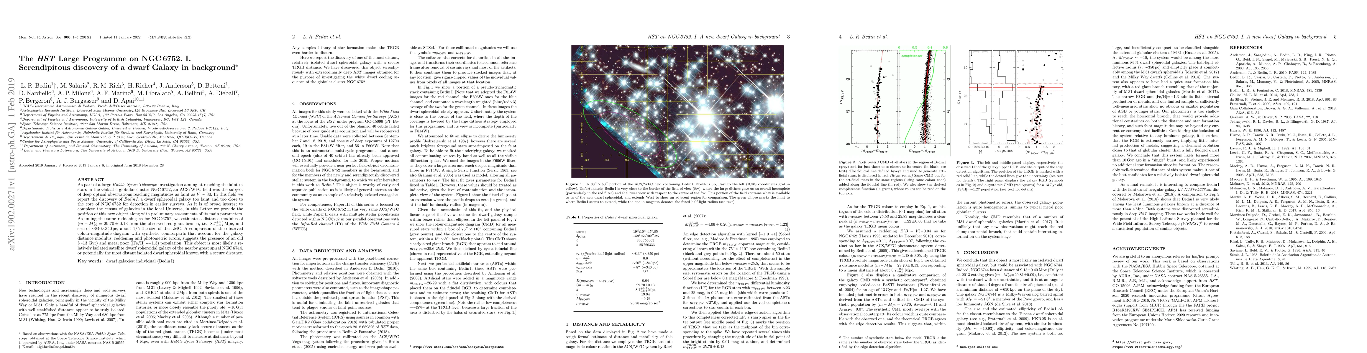 As part of a large Hubble Space Telescope investigation aiming at reaching the faintest stars in the Galactic globular cluster NGC 6752, an ACS/WFC field was the subject of deep optical observations reaching magnitudes as faint as V~30. In this field we report the discovery of Bedin I a dwarf spheroidal galaxy too faint and too close to the core of NGC 6752 for detection in earlier surveys. As it is of broad interest to complete the census of galaxies in the local Universe, in this Letter we provide the position of this new object along with preliminary assessments of its main param eters. Assuming the same reddening as for NGC 6752, we estimate a distance modulus of (m-M)_0 = 29.70+/-0.13 from the observed red giant branch, i.e., 8.7 (+0.5 -0.7) Mpc, and size of ~840x340pc, about 1/5 the size of the LMC. A comparison of the observed colour-magnitude diagram with synthetic counterparts that account for the galaxy distance modulus, reddening and photometric errors, suggests the presence of an old (~13Gyr) and metal poor ([Fe/H]~-1.3) population. This object is most likely a relatively isolated satellite dwarf spheroidal galaxy of the nearby great spiral NGC 6744, or potentially the most distant isolated dwarf spheroidal known with a secure distance.