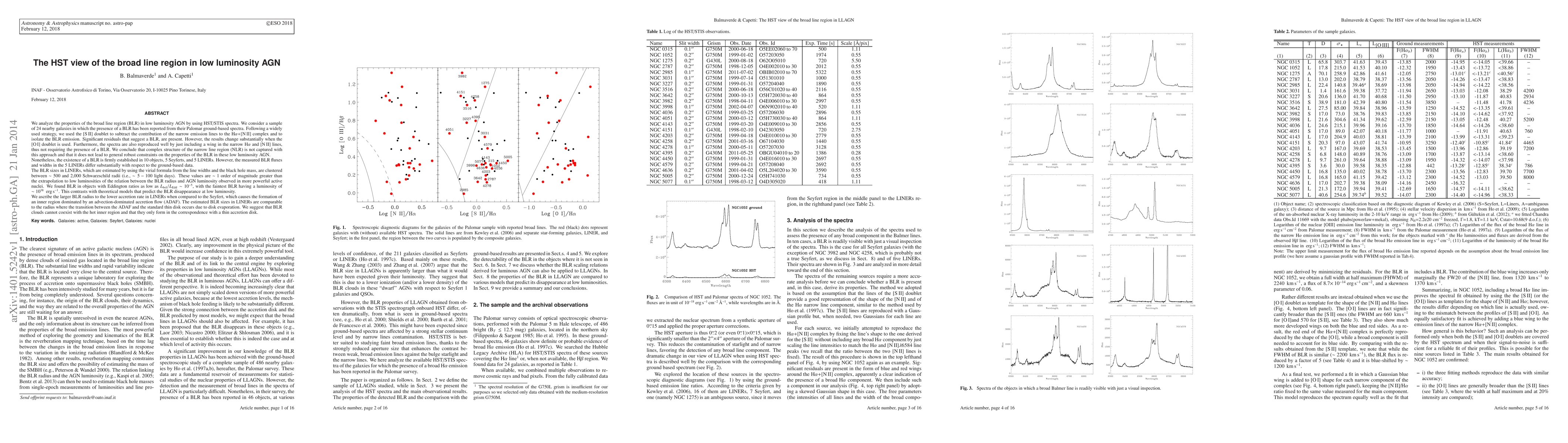 We analyze the properties of the broad line region (BLR) in low luminosity AGN by using HST/STIS spectra. We consider a sample of 24 nearby galaxies in which the presence of a BLR has been reported from their Palomar ground-based spectra. Following a widely used strategy, we used the [SII] doublet to subtract the contribution of the narrow emission lines to the H-alpha+[NII] complex and to isolate the BLR emission. Significant residuals that suggest a BLR, are present. However, the results change substantially when the [OI] doublet is used. Furthermore, the spectra are also reproduced well by just including a wing in the narrow H-alpha and [NII] lines, thus not requiring the presence of a BLR. We conclude that complex structure of the narrow line region (NLR) is not captured with this approach and that it does not lead to general robust constraints on the properties of the BLR in these low luminosity AGN. Nonetheless, the existence of a BLR is firmly established in 5 Seyferts, and 5 LINERs. However, the measured BLR fluxes and widths in the 5 LINERs differ substantially with respect to the ground-based data. The BLR sizes in LINERs, which are estimated by using the virial formula from the line widths and the black hole mass, are about 1 order of magnitude greater than the extrapolation to low luminosities of the relation between the BLR radius and AGN luminosity observed in more powerful active nuclei. We ascribe the larger BLR radius to the lower accretion rate in LINERs when compared to the Seyfert, which causes the formation of an inner region dominated by an advection-dominated accretion flow (ADAF). The estimated BLR sizes in LINERs are comparable to the radius where the transition between the ADAF and the standard thin disk occurs due to disk evaporation.