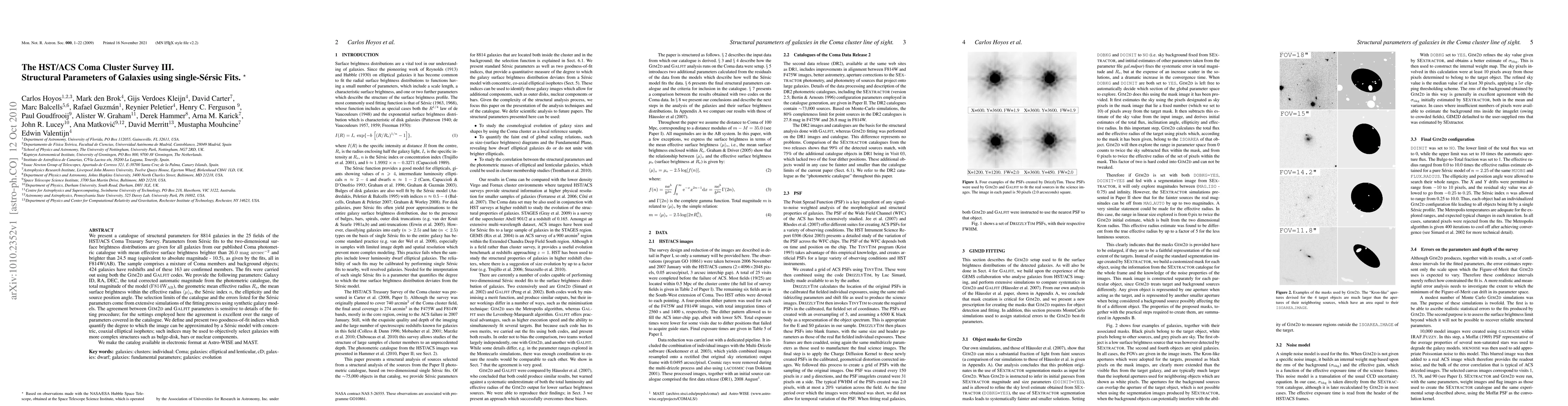 We present a catalogue of structural parameters for 8814 galaxies in the 25 fields of the HST/ACS Coma Treasury Survey. Parameters from S\'ersic fits to the two-dimensional surface brightness distributions are given for all galaxies from our published Coma photometric catalogue with mean effective surface brightness brighter than 26.0 mag/sq. arcsec and brighter than 24.5 mag (equivalent to absolute magnitude - 10.5), as given by the fits, all in F814W(AB). The sample comprises a mixture of Coma members and background objects; 424 galaxies have redshifts and of these 163 are confirmed members. The fits were carried out using both the Gim2D and Galfit codes. We provide the following parameters: Galaxy ID, RA, DEC, the total corrected automatic magnitude from the photometric catalogue, the total magnitude of the model (F814W_AB), the geometric mean effective radius Re, the mean surface brightness within the effective radius <{\mu}>_e, the S\'ersic index n, the ellipticity and the source position angle. The selection limits of the catalogue and the errors listed for the S\'ersic parameters come from extensive simulations of the fitting process using synthetic galaxy models. The agreement between Gim2D and Galfit parameters is sensitive to details of the fitting procedure; for the settings employed here the agreement is excellent over the range of parameters covered in the catalogue. We define and present two goodness-of-fit indices which quantify the degree to which the image can be approximated by a S\'ersic model with concentric, coaxial elliptical isophotes; such indices may be used to objectively select galaxies with more complex structures such as bulge-disk, bars or nuclear components. We make the catalog available in electronic format at Astro-WISE and MAST.