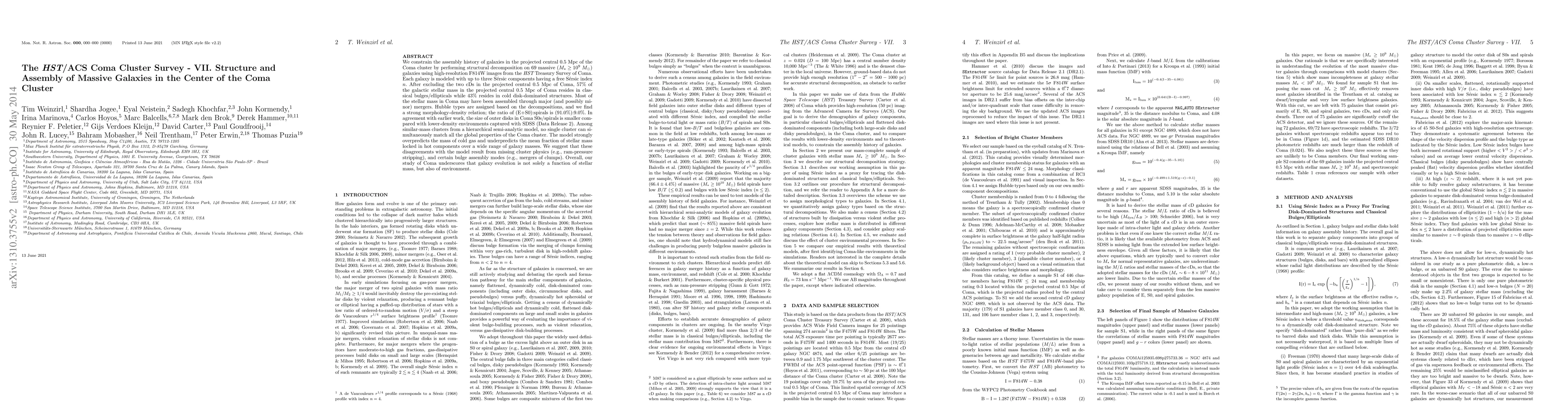 This study uses HST/ACS data to analyze the structure and assembly history of 69 massive galaxies in the Coma Cluster's central region, finding that 57% of the stellar mass is in classical bulges/ellipticals, while 43% is in cold disk-dominated structures, suggesting significant merger activity. The study highlights discrepancies between observed and modeled galaxy evolution, emphasizing the role of environmental factors in galaxy formation.