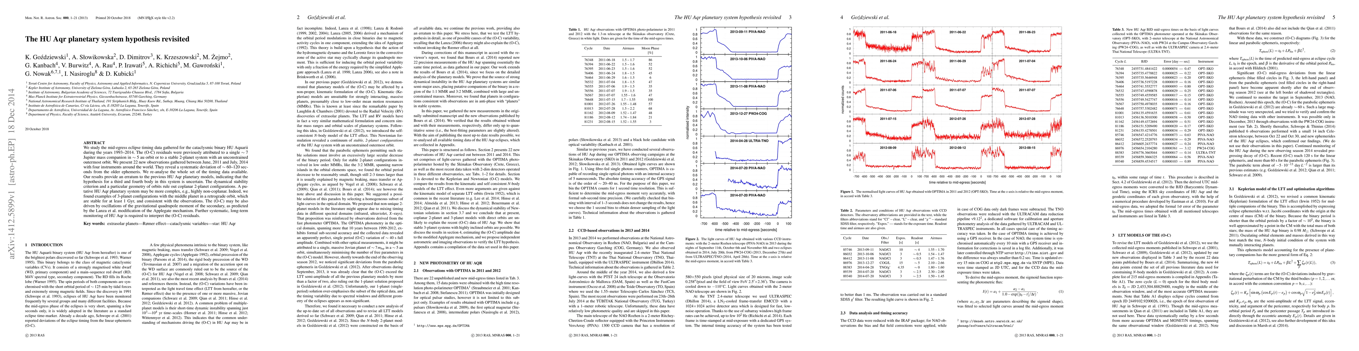 We study the mid-egress eclipse timing data gathered for the cataclysmic binary HU Aquarii during the years 1993-2014. The (O-C) residuals were previously attributed to a single ~7 Jupiter mass companion in ~5 au orbit or to a stable 2-planet system with an unconstrained outermost orbit. We present 22 new observations gathered between June, 2011 and July, 2014 with four instruments around the world. They reveal a systematic deviation of ~60 - 120 seconds from the older ephemeris. We re-analyse the whole set of the timing data available. Our results provide an erratum to the previous HU Aqr planetary models, indicating that the hypothesis for a third and fourth body in this system is uncertain. The dynamical stability criterion and a particular geometry of orbits rule out coplanar 2-planet configurations. A putative HU Aqr planetary system may be more complex, e.g., highly non-coplanar. Indeed, we found examples of 3-planet configurations with the middle planet in a retrograde orbit, which are stable for at least 1Gyr, and consistent with the observations. The (O-C) may be also driven by oscillations of the gravitational quadrupole moment of the secondary, as predicted by the Lanza et al. modification of the Applegate mechanism. Further systematic, long-term monitoring of HU Aqr is required to interpret the (O-C) residuals.