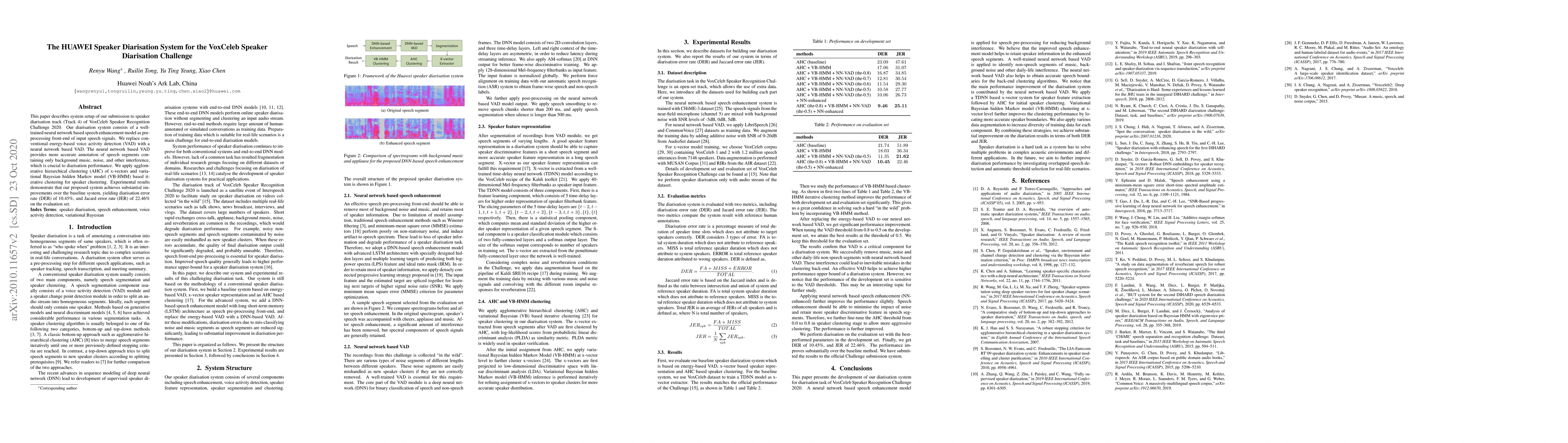 The paper introduces a neural network-based speech enhancement and VAD, combined with AHC and VB-HMM, for improved speaker diarisation in challenging conditions.