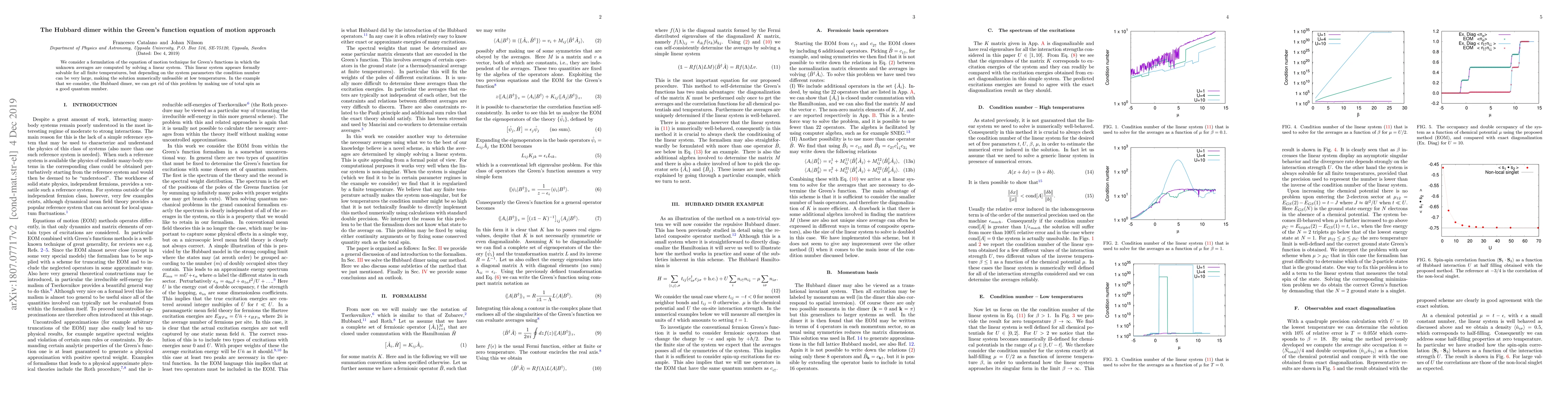 Summary: This paper explores the Green's function equation of motion approach for the Hubbard dimer, demonstrating that while the linear system is solvable at finite temperatures, low temperatures pose numerical challenges. The issue is resolved by leveraging total spin as a conserved quantum number.