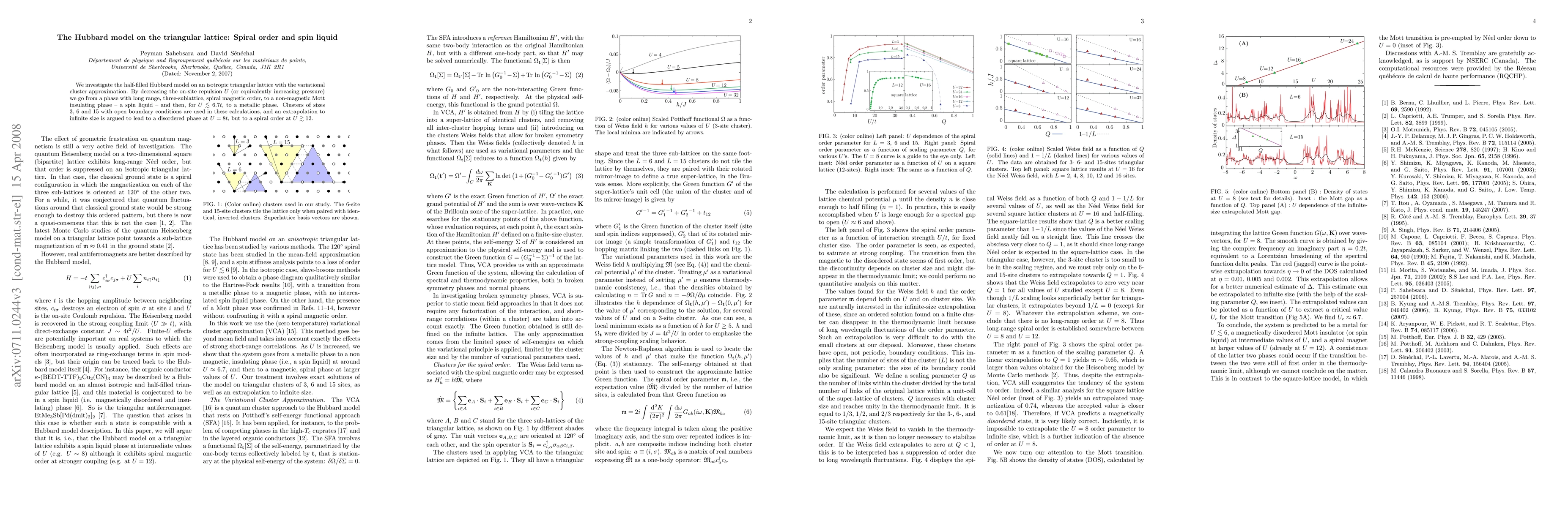 This paper explores the half-filled Hubbard model on a triangular lattice using the variational cluster approximation, revealing a transition from a spiral magnetic order to a spin liquid phase as on-site repulsion decreases, followed by a metallic phase. The study suggests a disordered phase at $U=8t$ and spiral order at $U\gtrsim 12$.