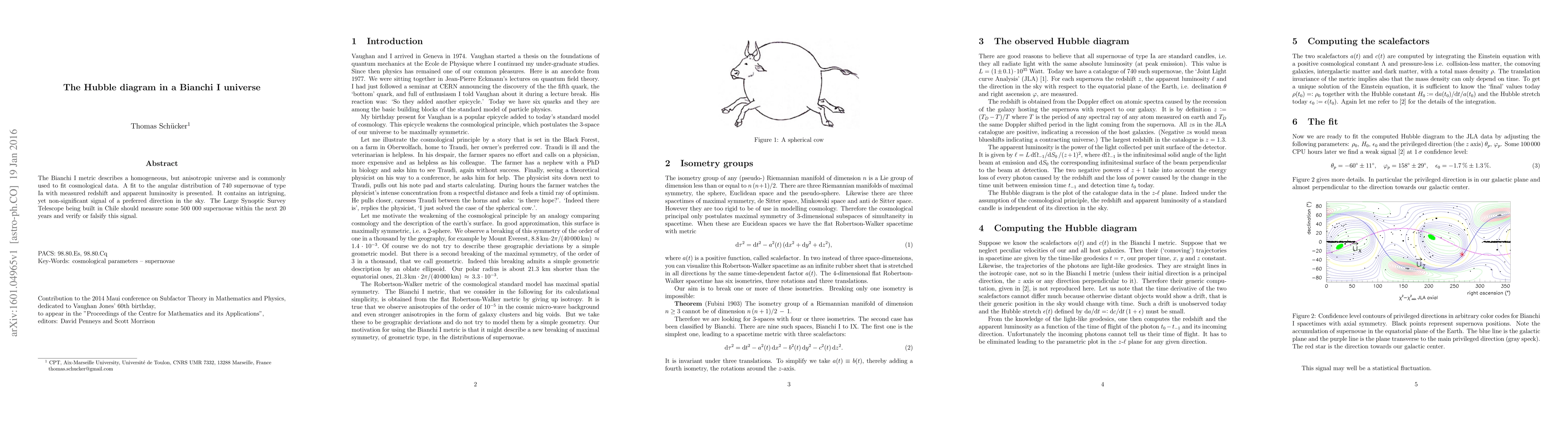 The Bianchi I metric describes a homogeneous, but anisotropic universe and is commonly used to fit cosmological data. A fit to the angular distribution of 740 supernovae of type Ia with measured redshift and apparent luminosity is presented. It contains an intriguing, yet non-significant signal of a preferred direction in the sky. The Large Synoptic Survey Telescope being built in Chile should measure some 500 000 supernovae within the next 20 years and verify or falsify this signal.