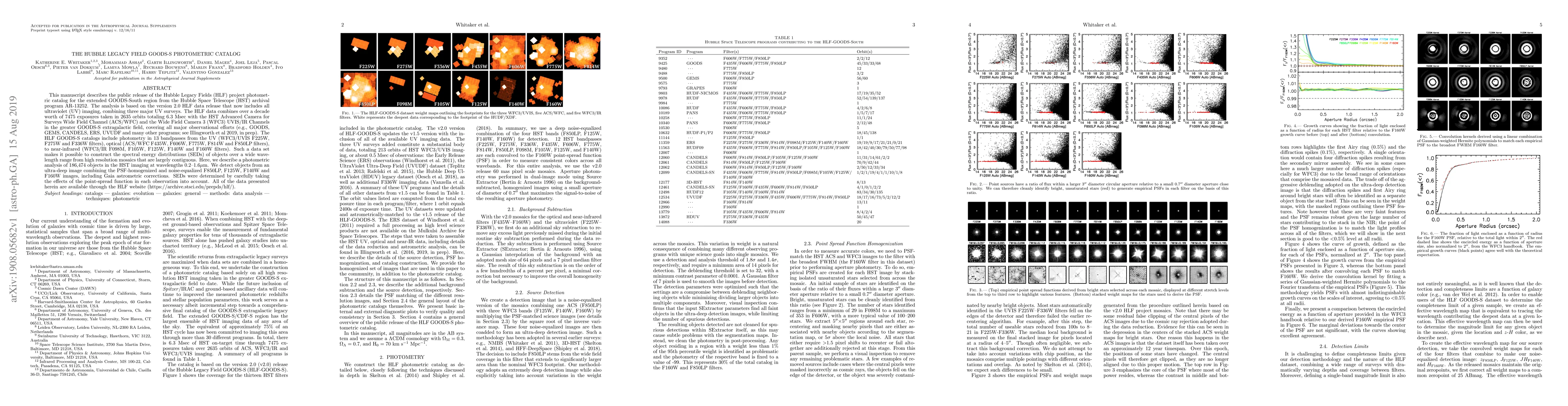 This manuscript describes the public release of the Hubble Legacy Fields (HLF) project photometric catalog for the extended GOODS-South region from the Hubble Space Telescope (HST) archival program AR-13252. The analysis is based on the version 2.0 HLF data release that now includes all ultraviolet (UV) imaging, combining three major UV surveys. The HLF data combines over a decade worth of 7475 exposures taken in 2635 orbits totaling 6.3 Msec with the HST Advanced Camera for Surveys Wide Field Channel (ACS/WFC) and the Wide Field Camera 3 (WFC3) UVIS/IR Channels in the greater GOODS-S extragalactic field, covering all major observational efforts (e.g., GOODS, GEMS, CANDELS, ERS, UVUDF and many other programs; see Illingworth et al 2019, in prep). The HLF GOODS-S catalogs include photometry in 13 bandpasses from the UV (WFC3/UVIS F225W, F275W and F336W filters), optical (ACS/WFC F435W, F606W, F775W, F814W and F850LP filters), to near-infrared (WFC3/IR F098M, F105W, F125W, F140W and F160W filters). Such a data set makes it possible to construct the spectral energy distributions (SEDs) of objects over a wide wavelength range from high resolution mosaics that are largely contiguous. Here, we describe a photometric analysis of 186,474 objects in the HST imaging at wavelengths 0.2--1.6$\mu$m. We detect objects from an ultra-deep image combining the PSF-homogenized and noise-equalized F850LP, F125W, F140W and F160W images, including Gaia astrometric corrections. SEDs were determined by carefully taking the effects of the point-spread function in each observation into account. All of the data presented herein are available through the HLF website (https://archive.stsci.edu/prepds/hlf/).
