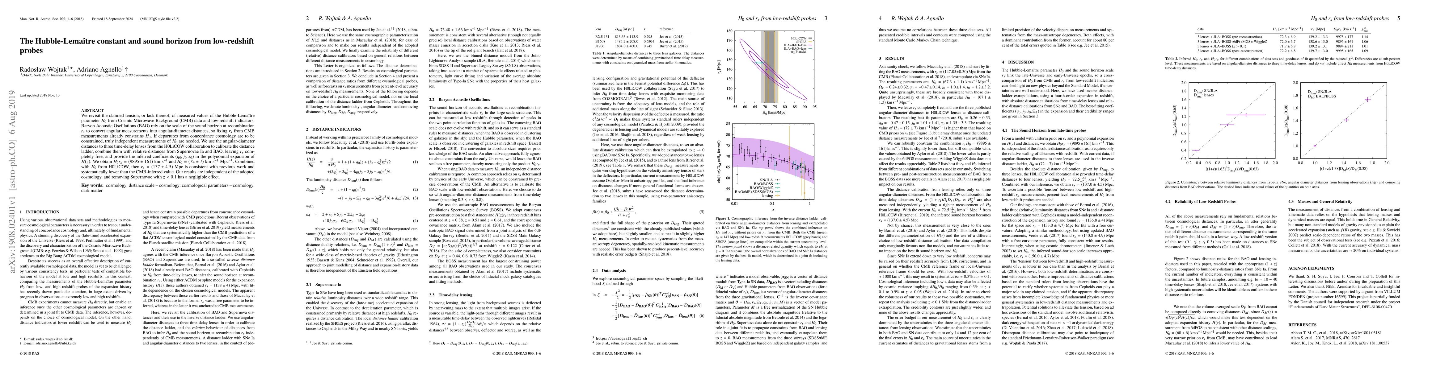 This paper recalibrates the distance ladder using three time-delay lenses and combines them with Supernovae Ia and BAO data to constrain the Hubble-Lema extit{tre constant, obtaining a value of $H_0 = 72 ext{ km/s/Mpc}$.