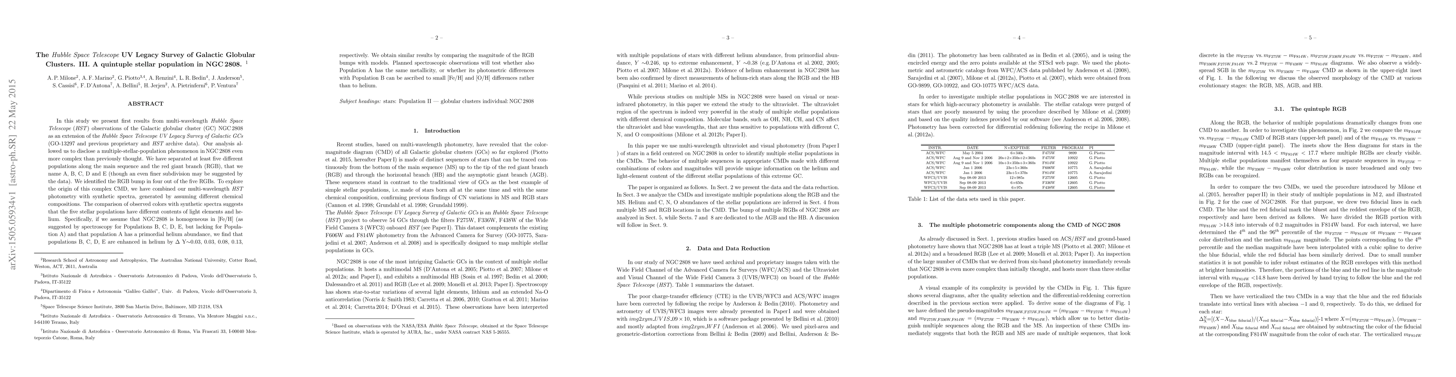 This study reveals a quintuple stellar population in NGC2808, a Galactic globular cluster, using HST UV Legacy Survey data. The analysis identifies five distinct populations (A-E) with varying light elements and helium content, suggesting complex formation histories.