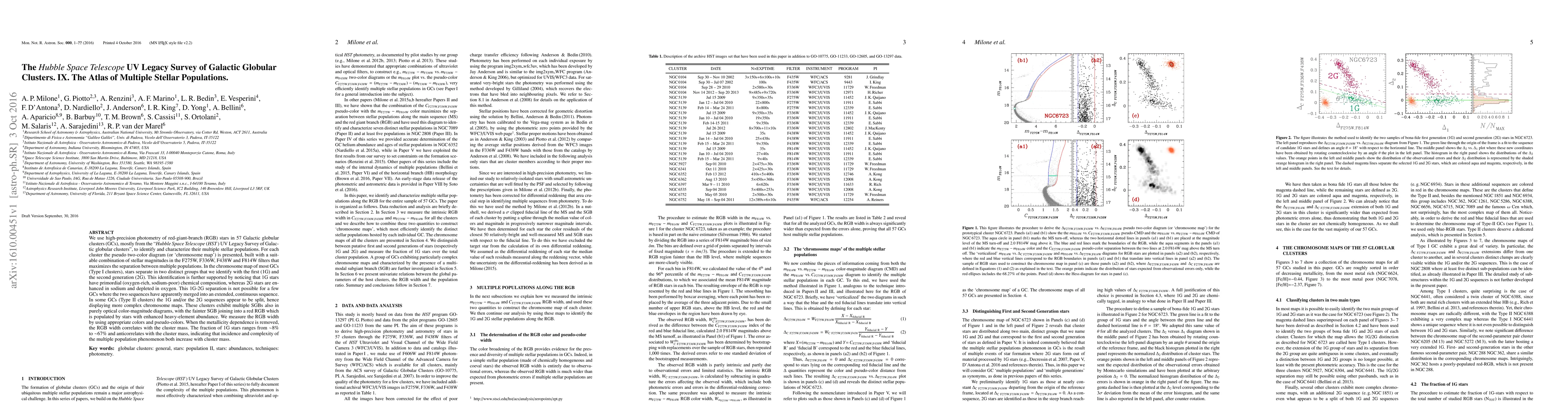 We use high-precision photometry of red-giant-branch (RGB) stars in 57 Galactic globular clusters (GCs), mostly from the `Hubble Space Telescope (HST) UV Legacy Survey of Galactic globular clusters', to identify and characterize their multiple stellar populations. For each cluster the pseudo two-color diagram (or `chromosome map') is presented, built with a suitable combination of stellar magnitudes in the F275W, F336W, F438W and F814W filters that maximizes the separation between multiple populations. In the chromosome map of most GCs (Type I clusters), stars separate in two distinct groups that we identify with the first (1G) and the second generation (2G). This identification is further supported by noticing that 1G stars have primordial (oxygen-rich, sodium-poor) chemical composition, whereas 2G stars are enhanced in sodium and depleted in oxygen. This 1G-2G separation is not possible for a few GCs where the two sequences have apparently merged into an extended, continuous sequence. In some GCs (Type II clusters) the 1G and/or the 2G sequences appear to be split, hence displaying more complex chromosome maps. These clusters exhibit multiple SGBs also in purely optical color-magnitude diagrams, with the fainter SGB joining into a red RGB which is populated by stars with enhanced heavy-element abundance. We measure the RGB width by using appropriate colors and pseudo-colors. When the metallicity dependence is removed, the RGB width correlates with the cluster mass. The fraction of 1G stars ranges from ~8% to ~67% and anticorrelates with the cluster mass, indicating that incidence and complexity of the multiple population phenomenon both increase with cluster mass.